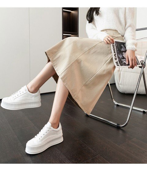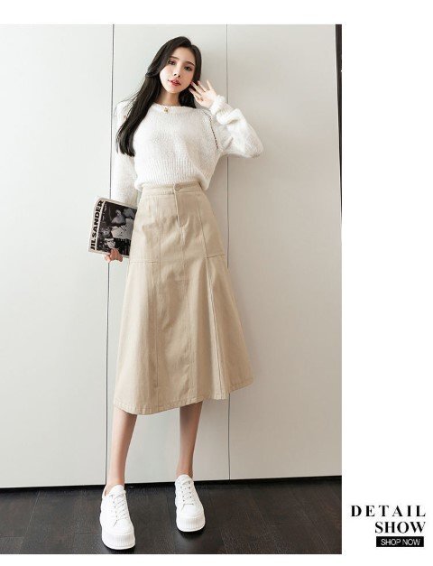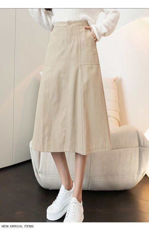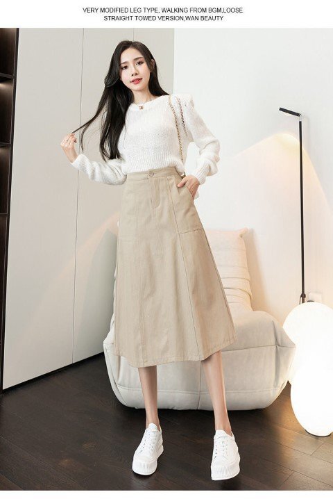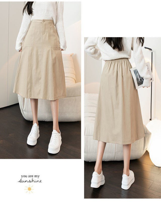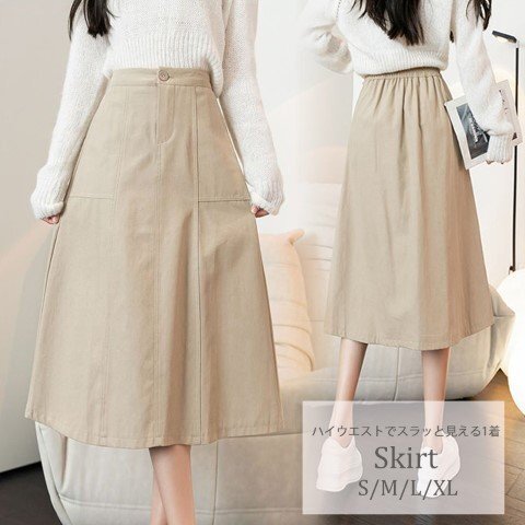 ・ハイウエストで全体的にスラッと見えるスカートです。Aラインで美シルエット。シンプルで着回し抜群◎