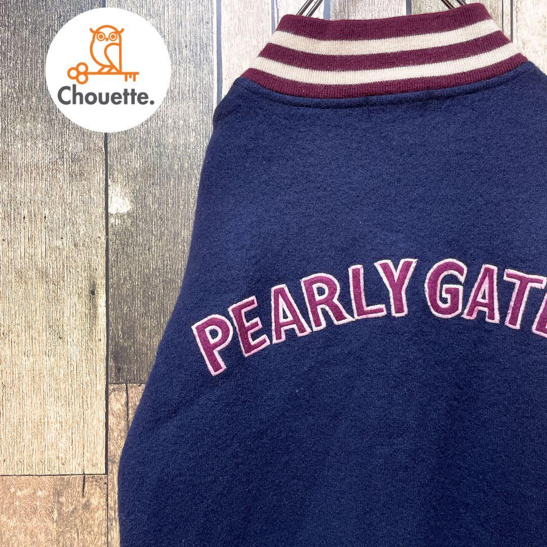 《激レア》パーリーゲイツ PEARLY GATES 紺☆スタジャン L 刺繍ロゴ 全刺繍 デカロゴ ビッグロゴ ワンポイントロゴ ボーダー柄 リブライン ネイビー h166