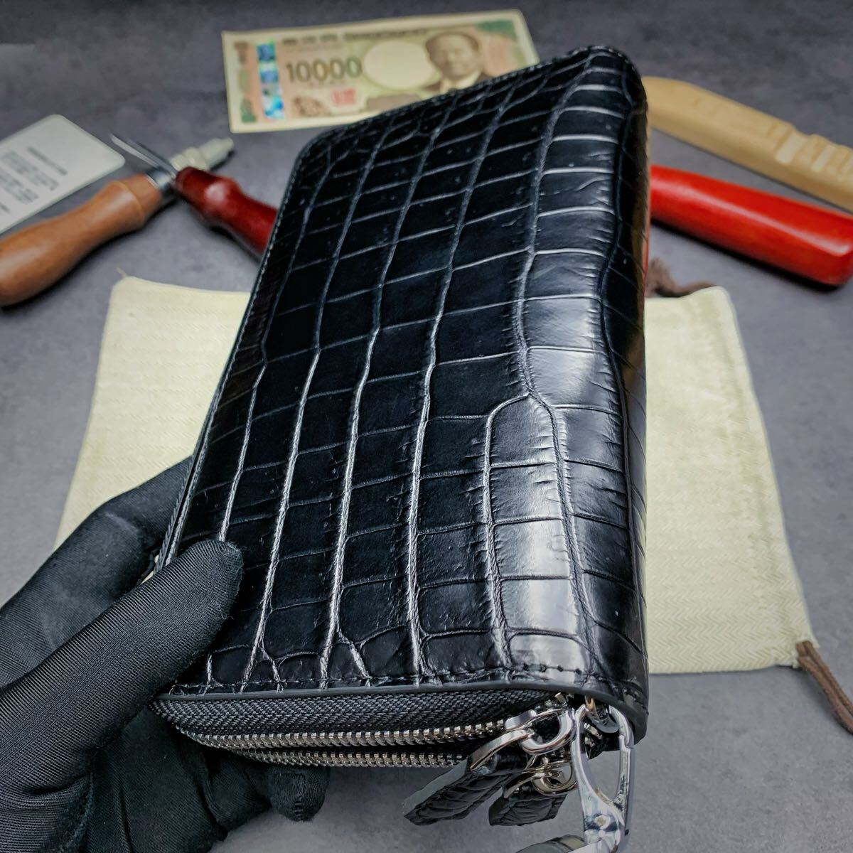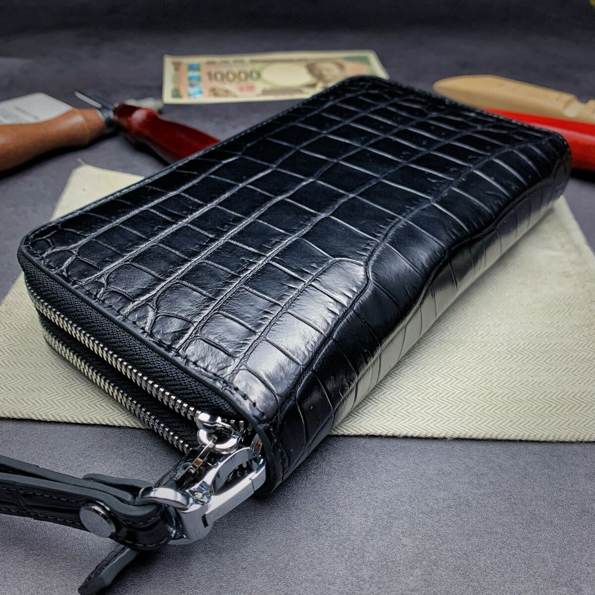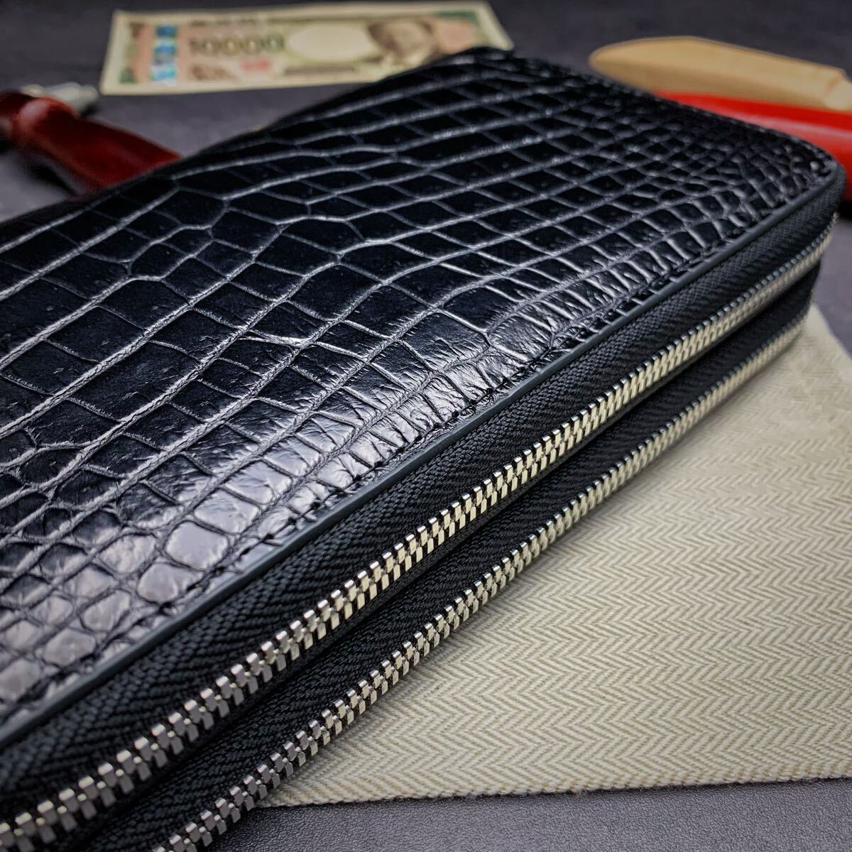 安心国内発送!本物ワニの腹革を使用したラウンドファスナー本革長財布です。