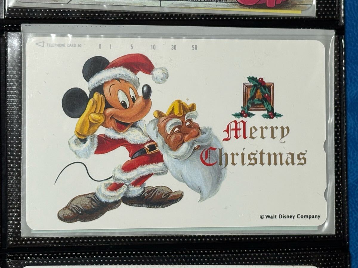 サンタクロースに扮したミッキーマウスが、サンタのヒゲと帽子を外して微笑むユニークなデザインのテレホンカードです。「Merry Christmas」の文字が添えられ、クリスマスシーズンにぴったりの一枚として人気があります。