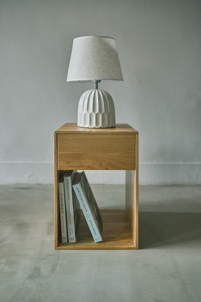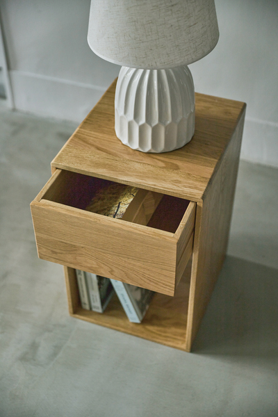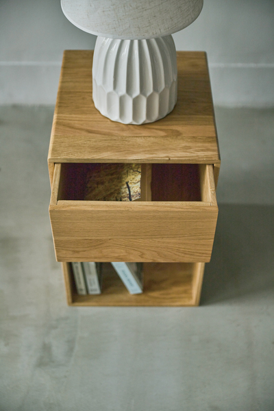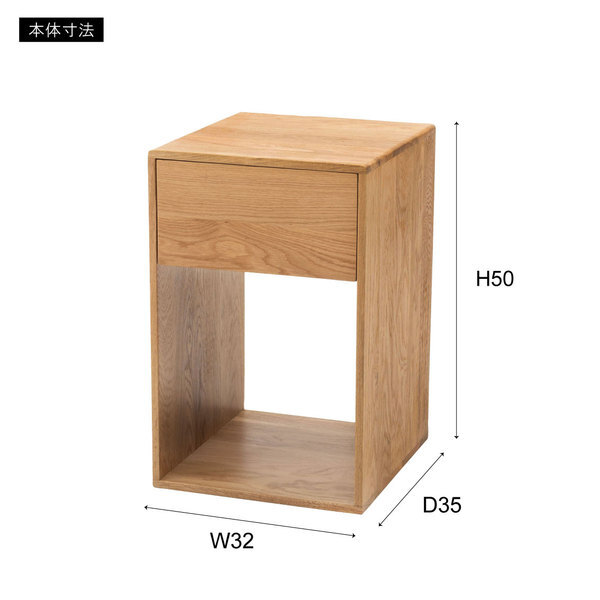 オークの木目が美しい、存在感のあるサイドチェスト個性豊かなホワイトオークのハギ材を使用した、飽きのこないデザインのチェスト。ベッドやソファの横に最適なサイズで、縦長のシンプルなフォルムがすっきりとしたお部屋を演出します。引き出しは収納に最適な深さと奥行で、見せる収納と隠す収納の両方としてお使いいただけます。サイズ:W32×D35×H50材質・素材:天然木(オーク ハギ材) 天然木(桐) ラッカー塗装耐荷重:20kg※こちらの商品は、北海道、沖縄県及び離島へお届けできません。サイドチェスト チェスト ナイトテーブル 収納 引き出し シンプル 北欧 おしゃれ かわいい ナチュラル ブラウン ベッド ソファ ブックスタンド コンパクト 木製 天然木 見せる収納 隠す収納※イメージ画像に含まれる備品等は商品に含まれません。(例:販売商品のテーブル等に合わせたチェアや敷物、カップやディシュ等)