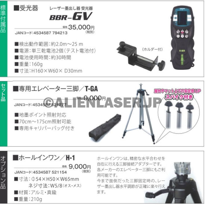 ■送料無料 1年保証 YSGOD ヤマシン 5ライン 自動誘導 グリーン スーパーシューティング 墨出し器 GV-06-W 本体+受光器+三脚たち線・水平ライン・大矩ライン(緑色レーザー)地墨ポイント(赤色レーザー)2電源方式充電&ACアダプタ標準付属品:専用ケース、レザーゴーグル、専用受光器、専用ACアダプター、リチウムイオン電池、リチウムイオン電池充電アダプター、取扱説明書、保証書、お客様登録用紙。■光源/可視光半導体レーザー2.5mW以下515nm(緑)地墨650nm(赤色レーザー)h■aレーザー安全基準/JISクラス1M■y本体寸法/本体W121×台座W116×H210mm■a使用時間/約3時間(全ライン照射)定格30分■h制動方式/磁気制動式(ジンバル式)■作業範囲/室内/約10m・屋外/約25m(受光器使用時)リモコン使用可能範囲は15m以内■水平・縦ライン精度10メートルで±1mm■直角精度90°±0.012°■自動補正範囲±3°■防塵・防滴設計IP54■受光器 BBR-GV■ホルダー付■三脚 T-GA■JAN 4534587 521277※モニターの発色具合により、実際のものと色が異なる場合がございます。