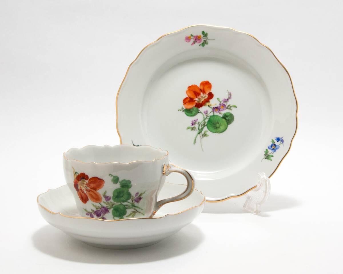 マイセン 金彩 花のブーケ文 二つ花 コーヒーカップ&ソーサー、ケーキ皿のトリオ