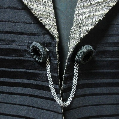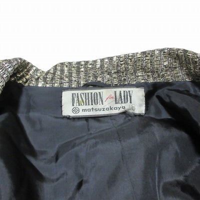 【状態】この商品には下記のようなダメージがあります。 ・ジャケットの右肩、両脇に変色、両脇に毛羽立ち ・衿のラメ糸に所々ほつれ有り ・ブランドタグにシミ ・ワンピースの上身頃、右サイド裾に変色、上身頃右側、背面右側、裾に糸引き、腰左側に個人補修跡有り ・ジャケット裏地にネーム刺? ※全体的に中古品としての使用感と上記のようなダメージがありますが、通常使用には支障のない商品です。 掲載写真や記載内容をご確認いただき、ご理解の上ご購入ください。