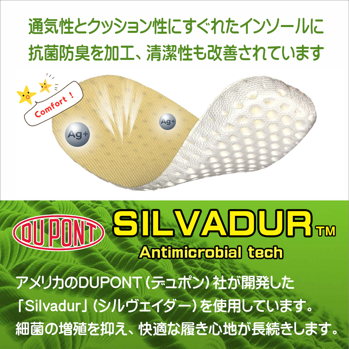 カップインソールには通気孔の加工をしており、クッション性が良く足裏の通気性抜群。アメリカデュポン社の薬剤を使用して抗菌防臭加工も施されており、取り外して丸洗いが出来るので、靴を清潔を保つことが出来ます。