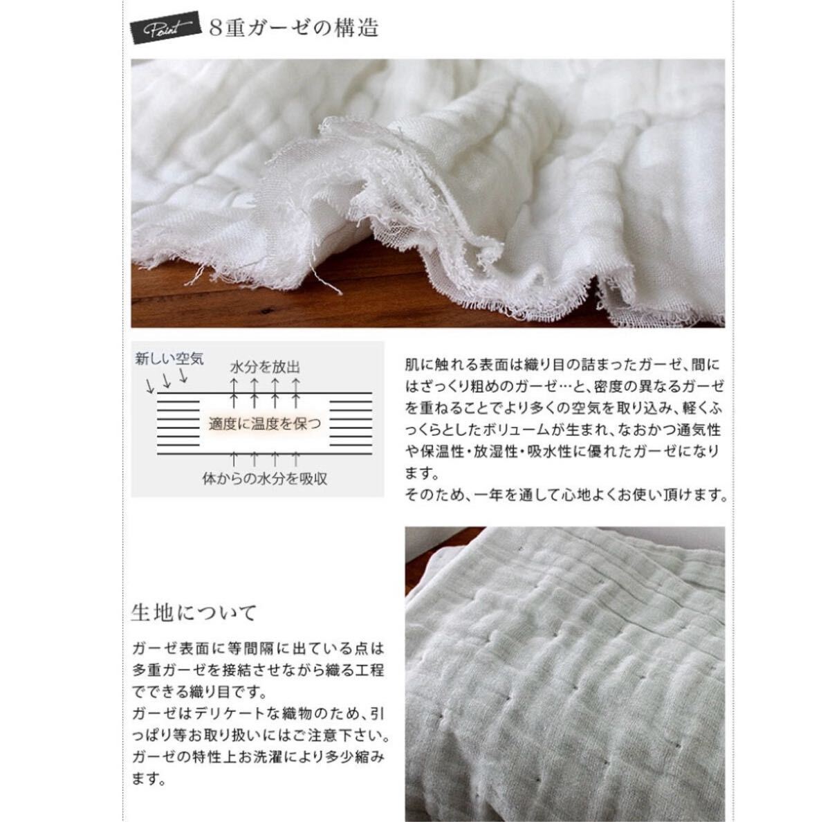 8重に重ねたガーゼ地が、たっぷりと空気を含み、ふかふかのボリュームと、とろけるような柔らかさを感じられます。