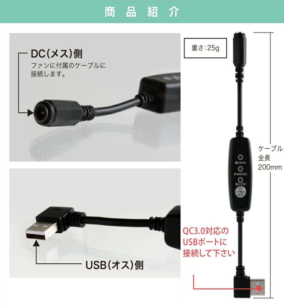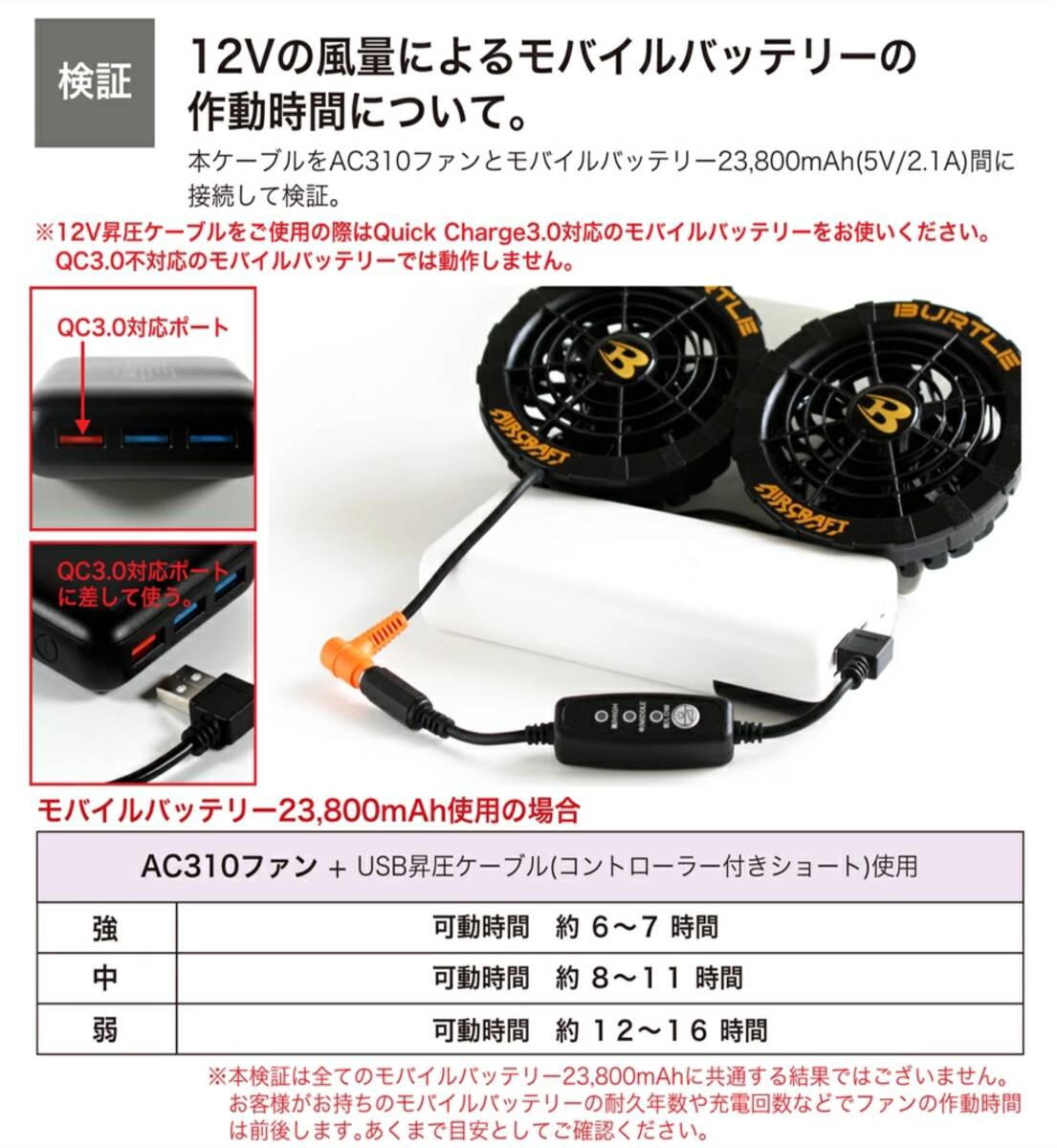 バートル エアクラフト 12V USB変換アダプター AC310 AC311 QC3.0対応バッテリー専用 バートルファン 昇圧 変換ケーブル 【12V-Cスイッチ】