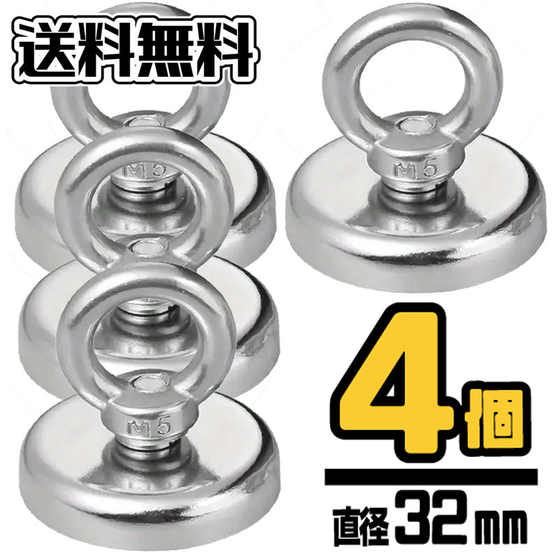 【4個入】★ 直径32mm ★ 超強力 ネオジム磁石 ★ マグネットフック★ 送料無料 ★