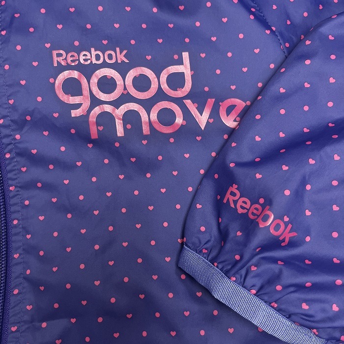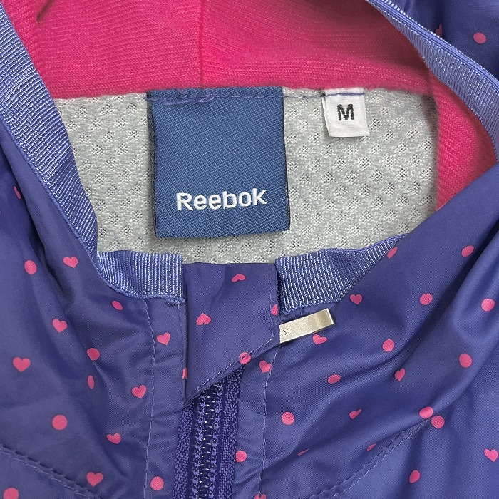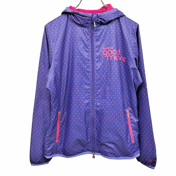 | 商品タイトル | リーボック 薄手 ジャケット パーカー 微起毛裏地 ハート×ドット柄 ハイネックフード 長袖 ポリ100% M パープル 紫×ピンク レディース |