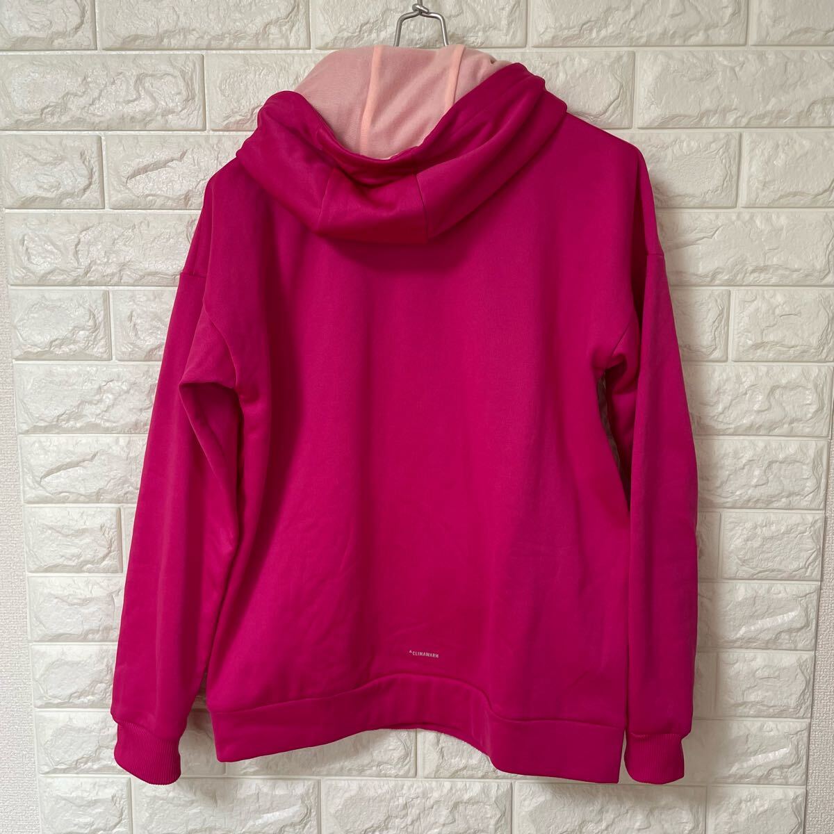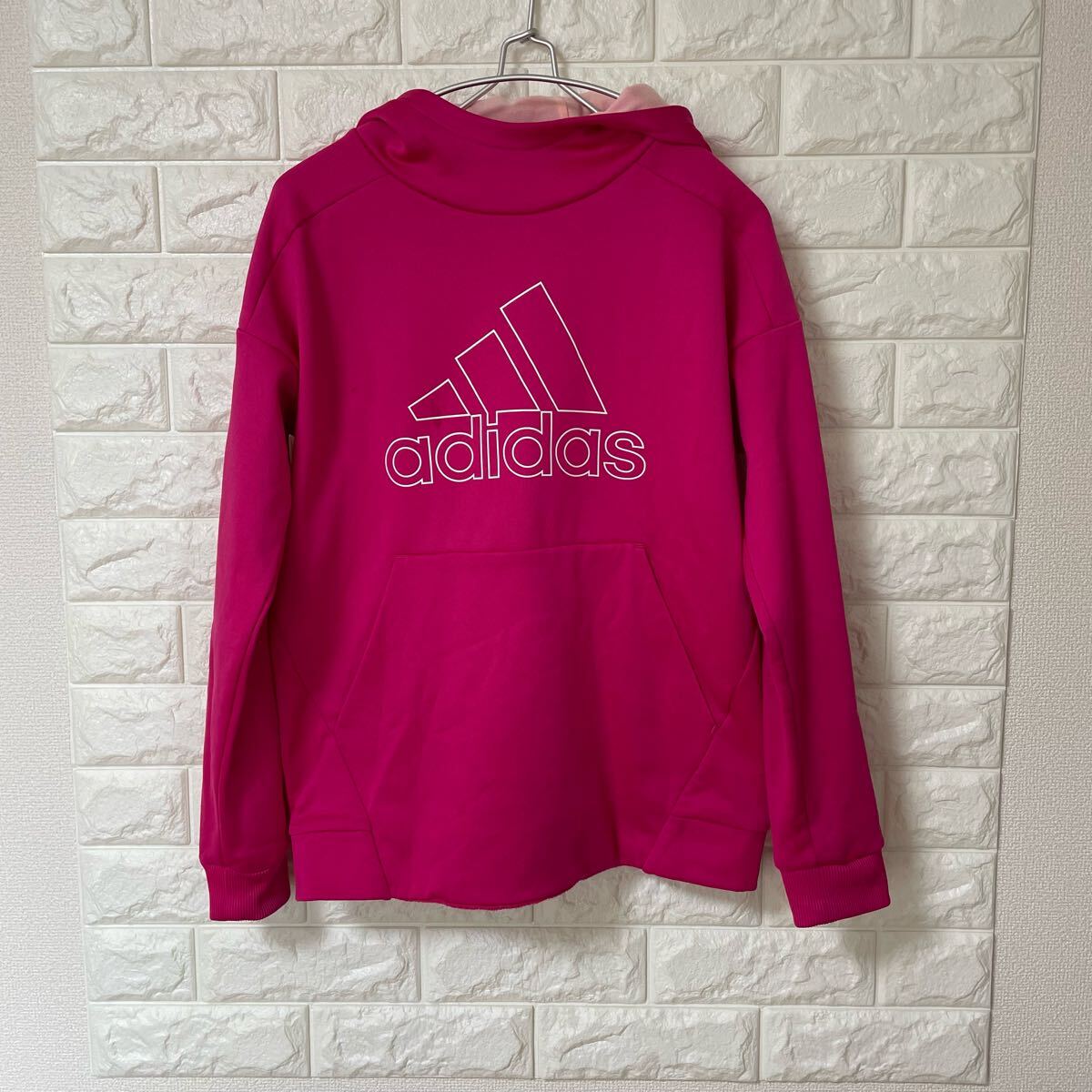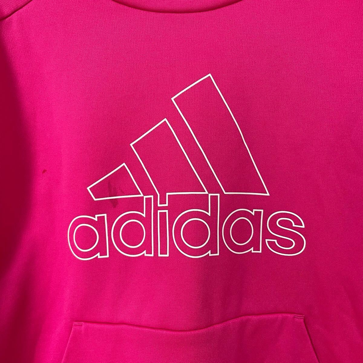 鮮やかなピンクのadidasパーカー、フード付きでロゴデザインが特徴。