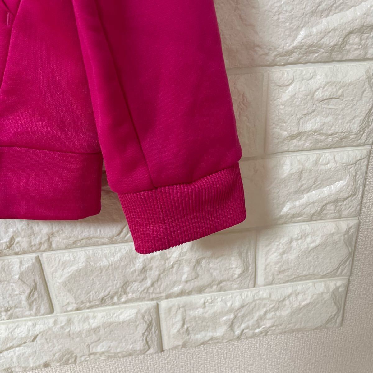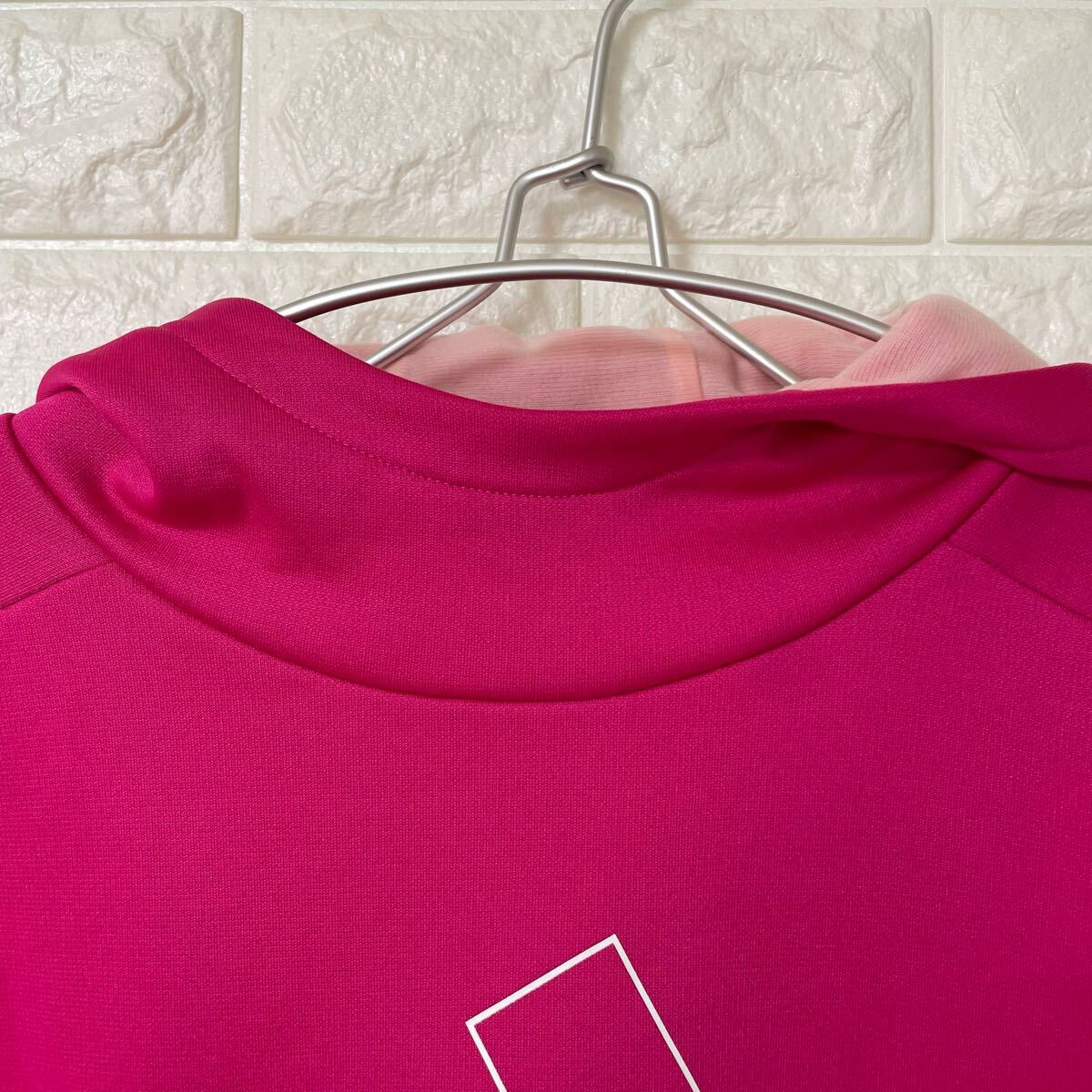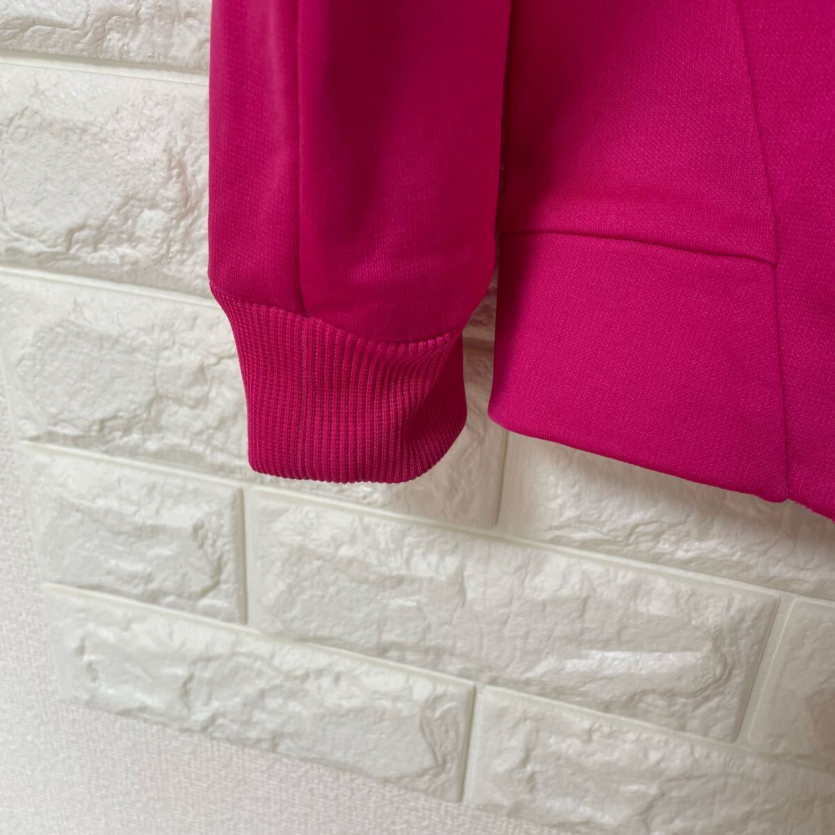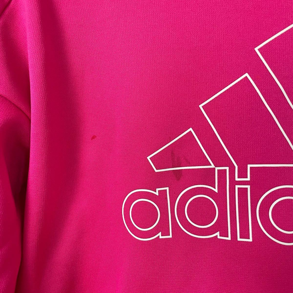 鮮やかなピンクのadidasパーカー、フード付きでロゴデザインが特徴。