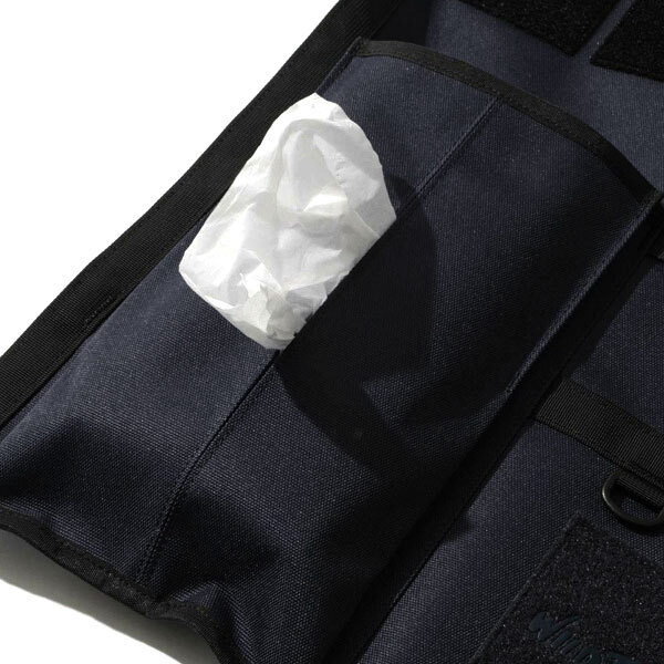 左下にはボックスティッシュ、マジックテープ、 D カン、ループには別売アイテムをカスタマイズも可能。