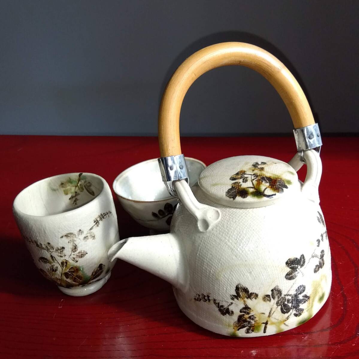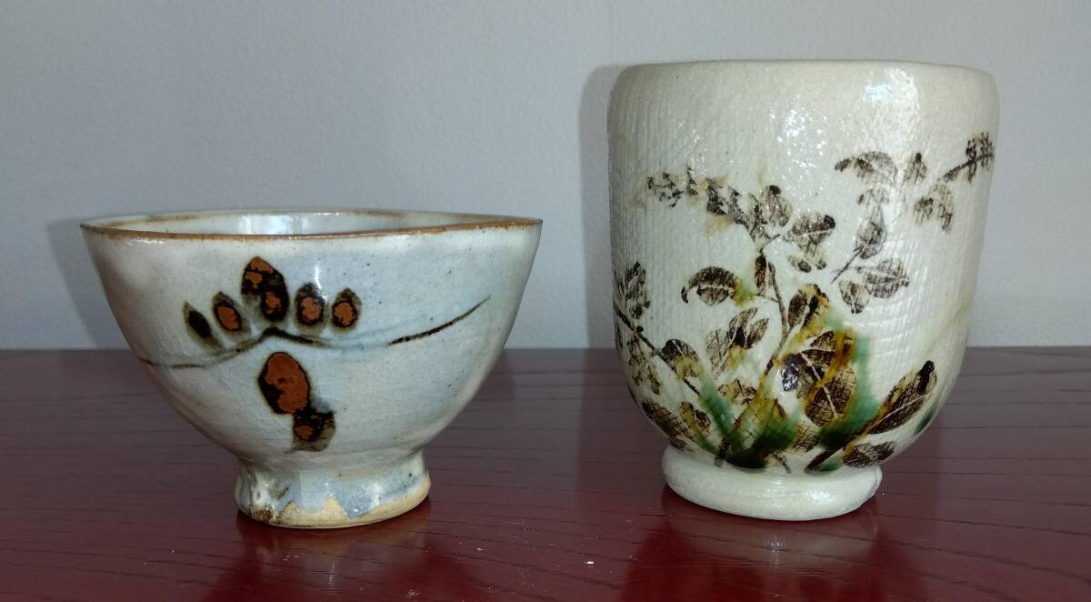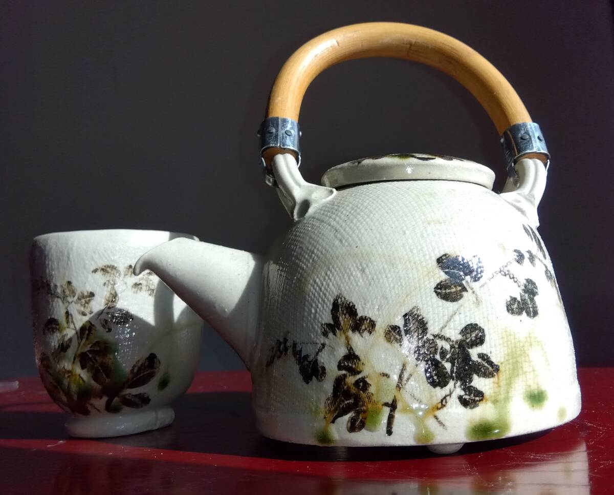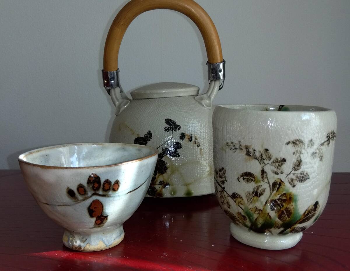 美濃焼の名工 陶芸家 山田義孝 日本工芸会正会員 希少美品手書き作品 取っ手無し急須と湯呑みセット 師の手書きの至高技術による織部の複雑な萩蔦草文様 そして見事な色釉や絵付けが表面の布目質感と交わり布目が食いこんだ跡には釉薬がたまり、色の濃淡が醸し出す秋の枯れた風情をご堪能下さい。 卓越したろくろへら使いとタタラ布地網目模様が布跡で変化し 触った感触も適度なザラつきが出てやわらかい質感となりタタラ布地網目模様が布跡で変化する色の濃淡や微細な凹凸による影など、視覚的にも効果的な卓越した装飾技法がお茶の味わいを格別な世界へ導いてくれます!!! 急須サイズ 【2】取っ手無し 手持ち全高185mm蓋込み高105mm 蓋口径50㎜ 見込み深75mm 幅厚/注ぎ口込み115/165mm底径116mm 湯み大 口径70mm見込み75mm高台厚/径8/45mm 湯み小 口径85mm見込み45mm高台厚/径10/18mm 包装:クラフトボックスプチプチ包装 【山田義孝陶歴: 昭和25年生 岐阜県土岐市に生まれる。日本伝統工芸展、中日国際陶芸展ほか入選。日本工芸会正会員。美濃陶芸協会参事。中津川市福岡 万葉工房