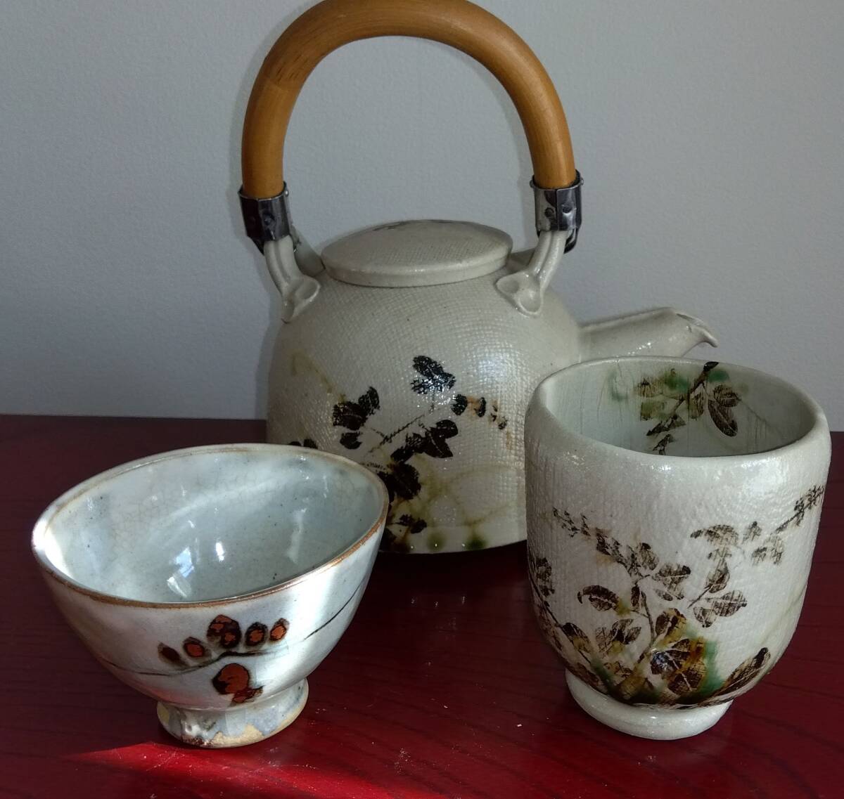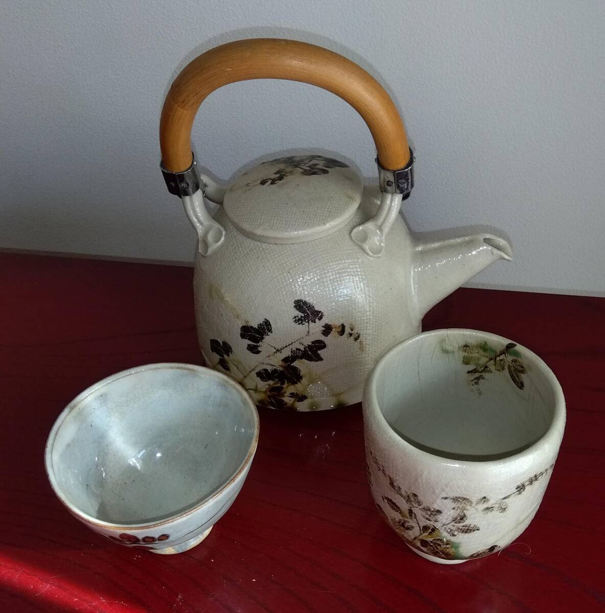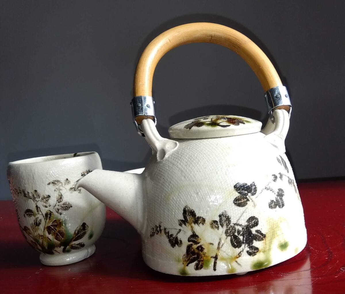 美濃焼の名工 陶芸家 山田義孝 日本工芸会正会員 希少美品手書き作品 取っ手無し急須と湯呑みセット 師の手書きの至高技術による織部の複雑な萩蔦草文様 そして見事な色釉や絵付けが表面の布目質感と交わり布目が食いこんだ跡には釉薬がたまり、色の濃淡が醸し出す秋の枯れた風情をご堪能下さい。 卓越したろくろへら使いとタタラ布地網目模様が布跡で変化し 触った感触も適度なザラつきが出てやわらかい質感となりタタラ布地網目模様が布跡で変化する色の濃淡や微細な凹凸による影など、視覚的にも効果的な卓越した装飾技法がお茶の味わいを格別な世界へ導いてくれます!!! 急須サイズ 【2】取っ手無し 手持ち全高185mm蓋込み高105mm 蓋口径50㎜ 見込み深75mm 幅厚/注ぎ口込み115/165mm底径116mm 湯み大 口径70mm見込み75mm高台厚/径8/45mm 湯み小 口径85mm見込み45mm高台厚/径10/18mm 包装:クラフトボックスプチプチ包装 【山田義孝陶歴: 昭和25年生 岐阜県土岐市に生まれる。日本伝統工芸展、中日国際陶芸展ほか入選。日本工芸会正会員。美濃陶芸協会参事。中津川市福岡 万葉工房