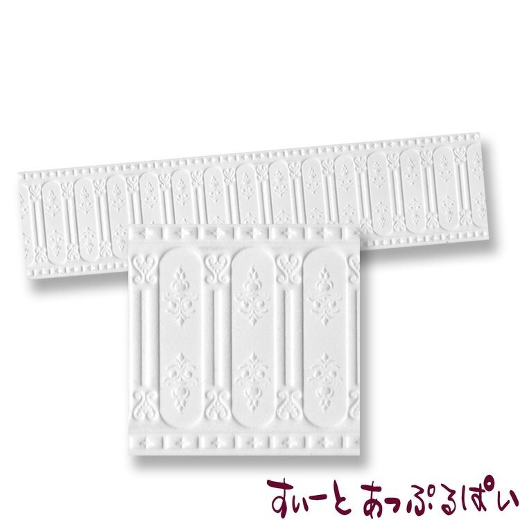 スペイン製のドールハウス用テクスチャーシートです。壁の下部に貼る、腰壁シートです。素材はポリカード(紙)ですが、お風呂の中に敷くマットのような柔らかい感触です。厚みは約2mm強です。アクリル絵の具等でお好みに着色してお使いください。ビニールコーティング等はされておりませんので、水彩絵の具やステインなど、浸み込むタイプの塗料もお使いいただけます。普通のカッターでカットできます。シートのサイズは350x85 mm です。スケールは1/12です。スペイン直輸入です!