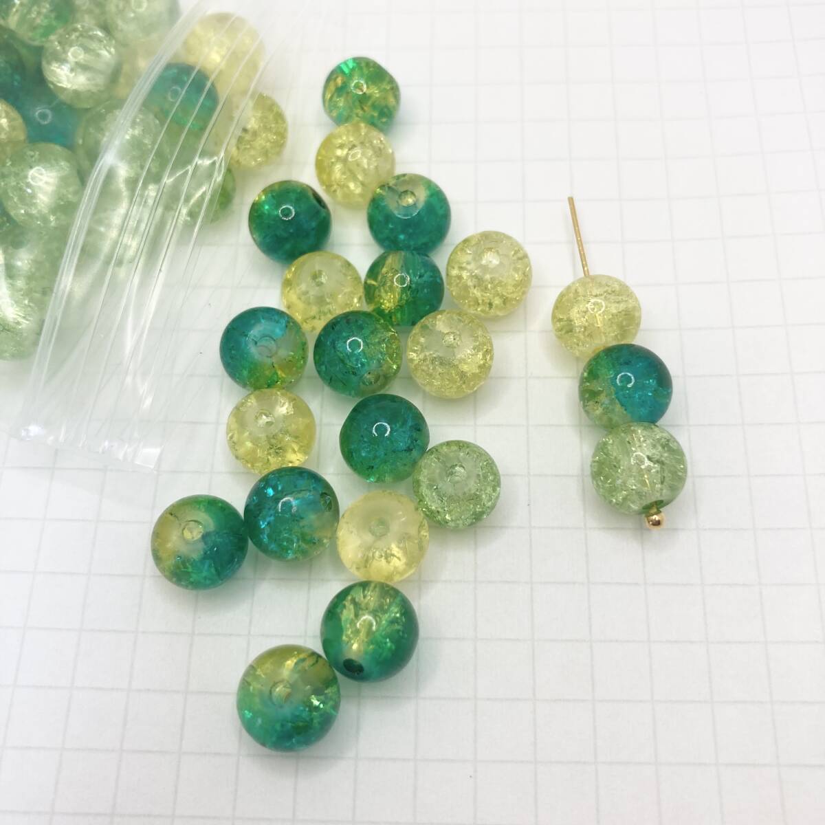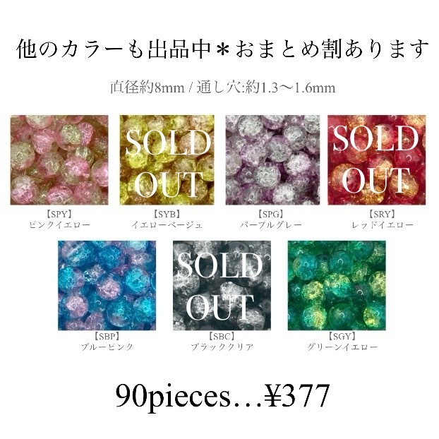 | 内側にひび割れ加工がされ、 キラキラ反射するクラックガラスビーズ! 割れ加工具合はそれぞれ異なります、 3色×30個=90個入り。 size 直径:8mm 通し穴:1.3〜1.6mm |