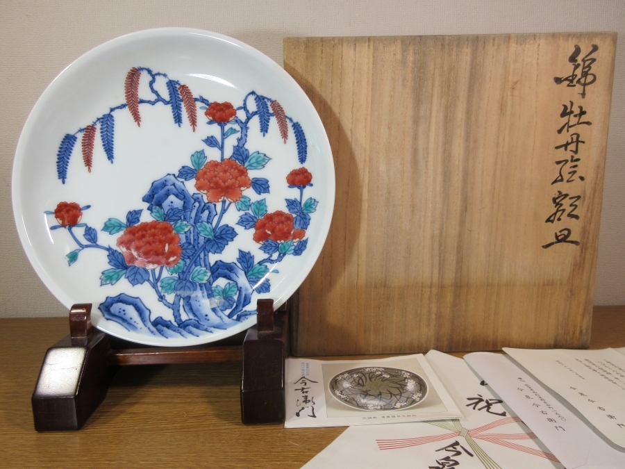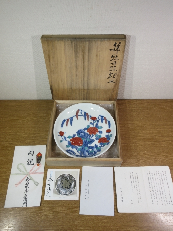 | 説明 | 佐賀県出身 陶芸家で人間国宝 13代 今泉今右衛門の、 『錦牡丹絵額皿』無傷 共箱 シオリ付です。 状態は良好です。 このままで飾って楽しめますし、使用しても楽しめます。 高台内に「今右衛門」と銘があります。 箱は経年感がありますが、収納には問題ありません。 見込みに描かれた牡丹絵が大変綺麗で華やかな作品です。 コレクターの放出品です、画像で御確認下さい。 皿立ては、撮影の為に使用したもので、作品には付帯致しません。 ★九州地方の買出し品です。 買出したままでの出品です、御入札宜しくお願い致します。 入札は早めにお願い致します。 一人でも入札があれば梱包作業に入りますので、素早い発送が可能です。 早期終了あり。 13代今泉今右衛門は、(1926-2001) 昭和後期-平成時代の陶芸家。 大正15年3月31日生まれ。 佐賀県出身。 東京美術学校卒。 本名は善詔。 父の12代今右衛門に色鍋島をまなぶ。 昭和32年日展初入選。 54年日本伝統工芸展NHK会長賞。 伝統の色鍋島に染付吹墨, 薄墨などの技法をとりいれた作風をきずく。 平成元年色絵磁器で人間国宝。 平成13年10月13日死去 75歳。 作品に「色鍋島薄墨露草文鉢」など。 |