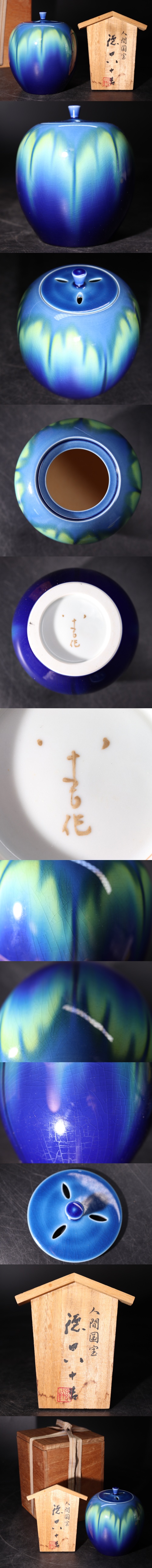 | 人間国宝 徳田八十吉 作 碧明輝彩 香炉 木箱付 / 九谷 名工 香道具 煎茶道具 煎茶飾 .G1943 |
