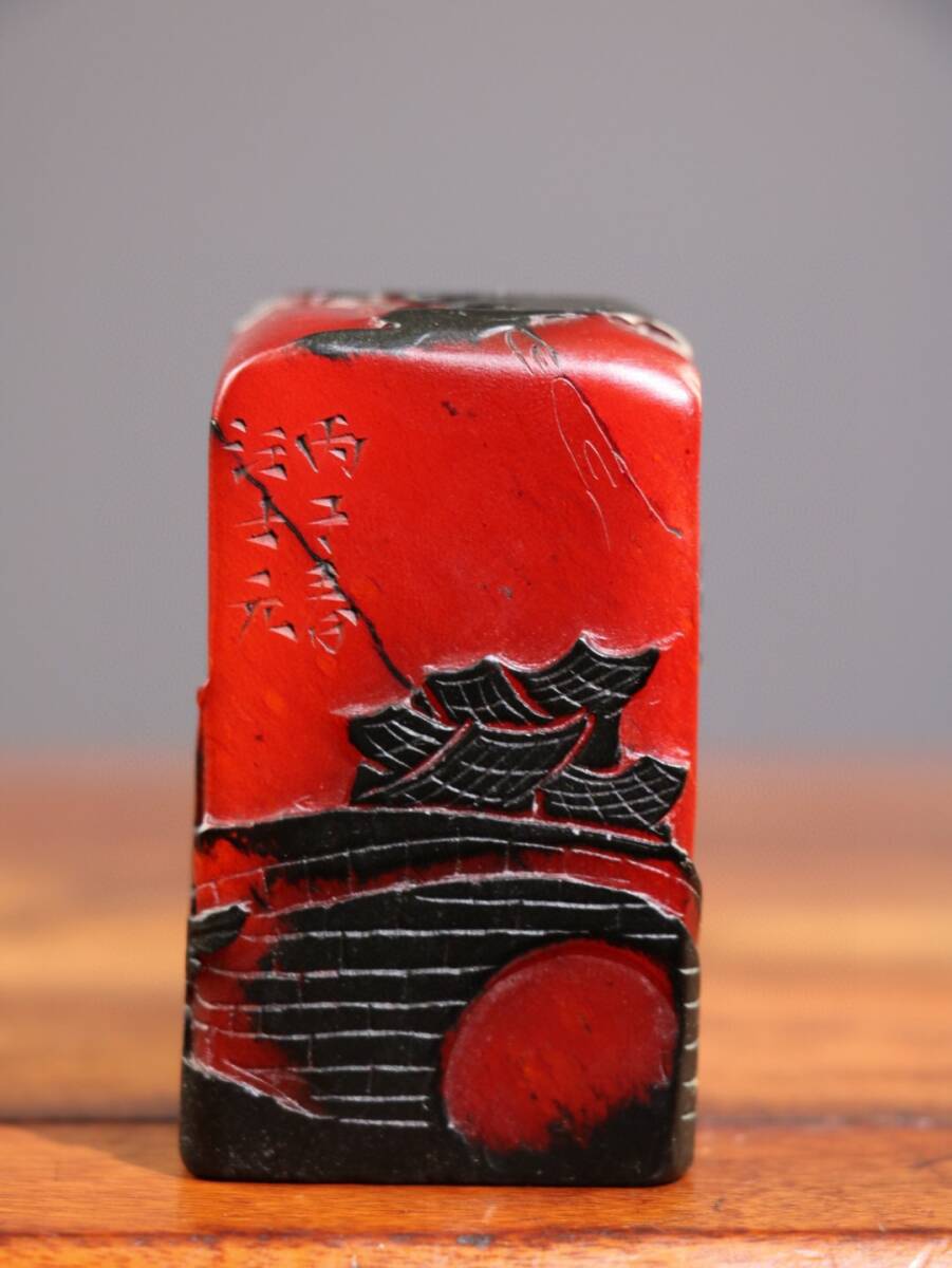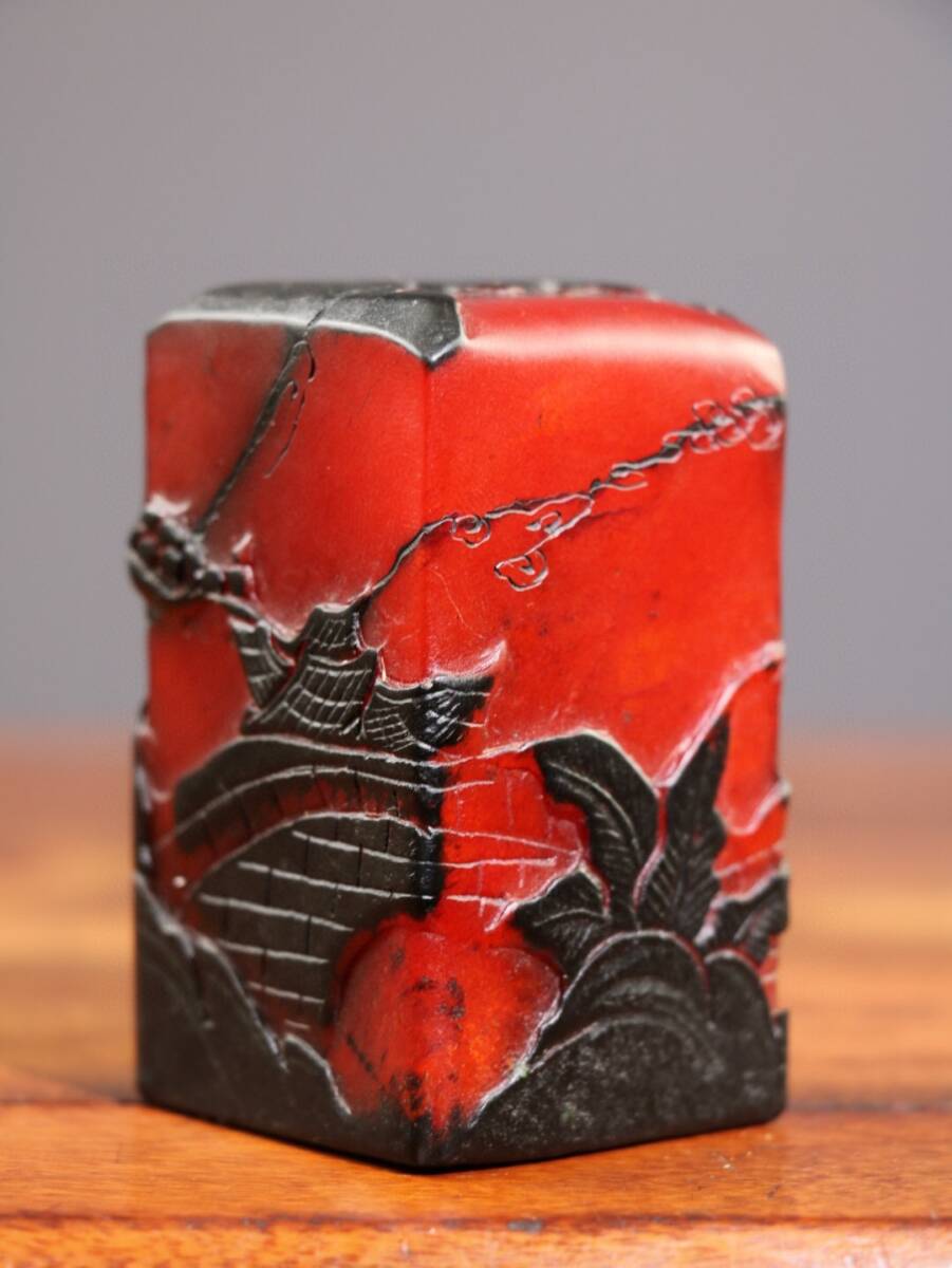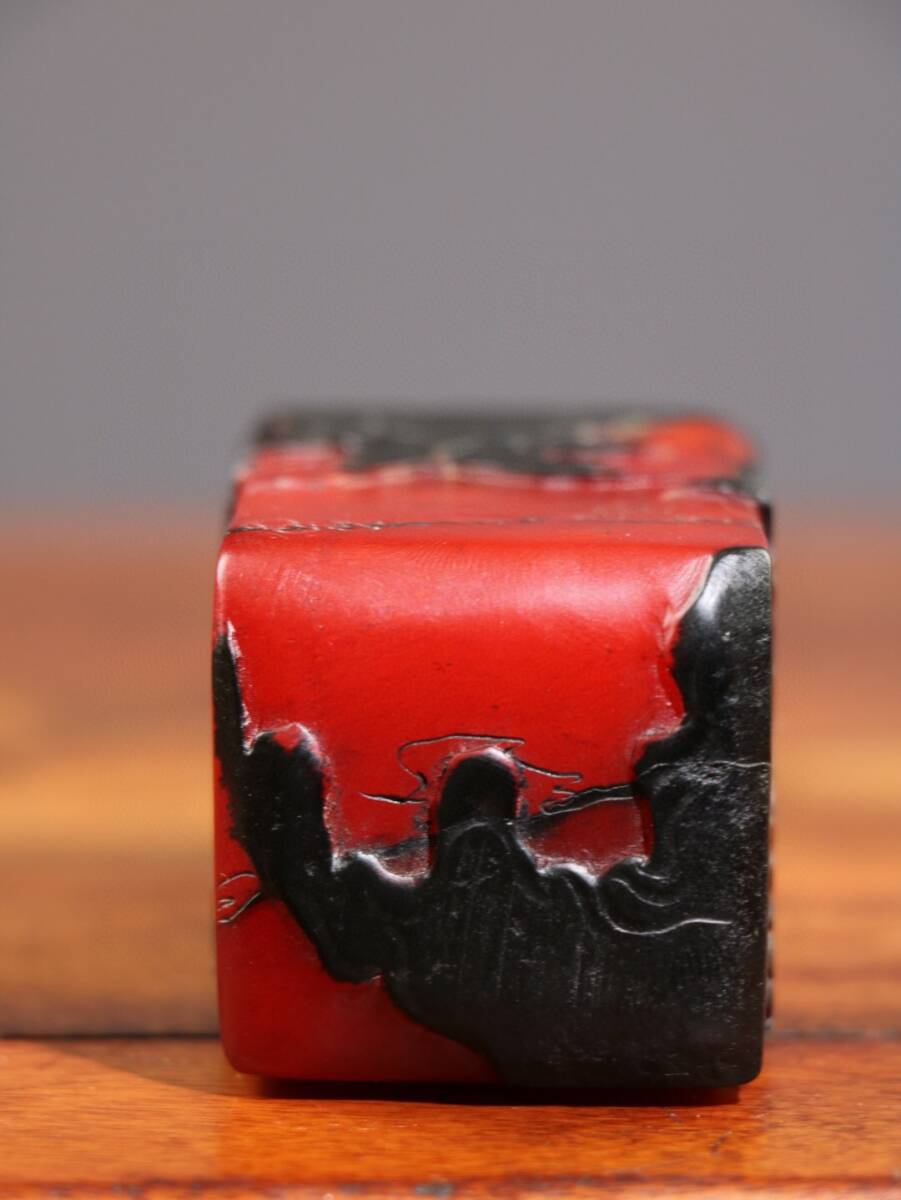 【超珍館蔵】寿山石 烏鴉皮 紅田黄石 細密彫 觀滄海紋印章 印章 印鑒 文房具 書道品 古賞物 古董品 古美術品 時代物 旧家蔵出 稀少珍蔵品