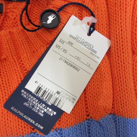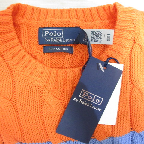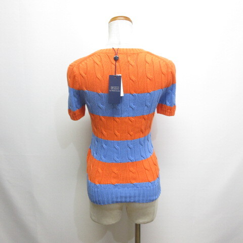 未使用品 ポロ バイ ラルフローレン Polo by Ralph Lauren ボーダー柄 半袖 ケーブル ニット セーター XS オレンジ×ブルー ポニー刺繍