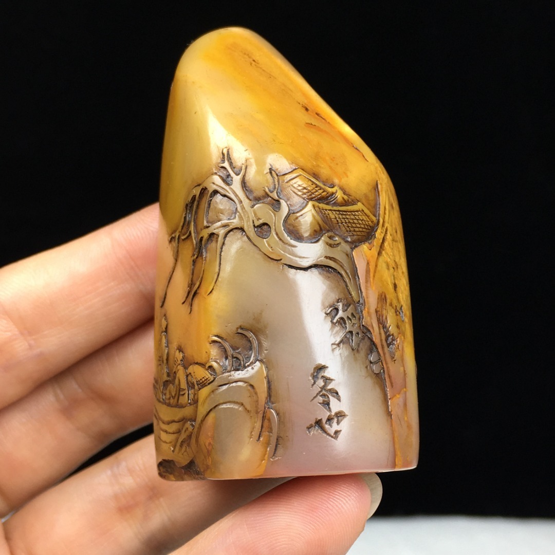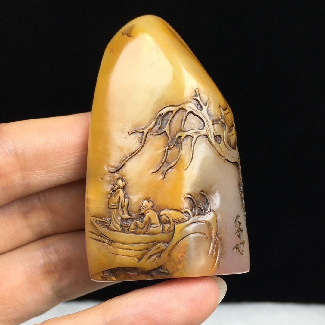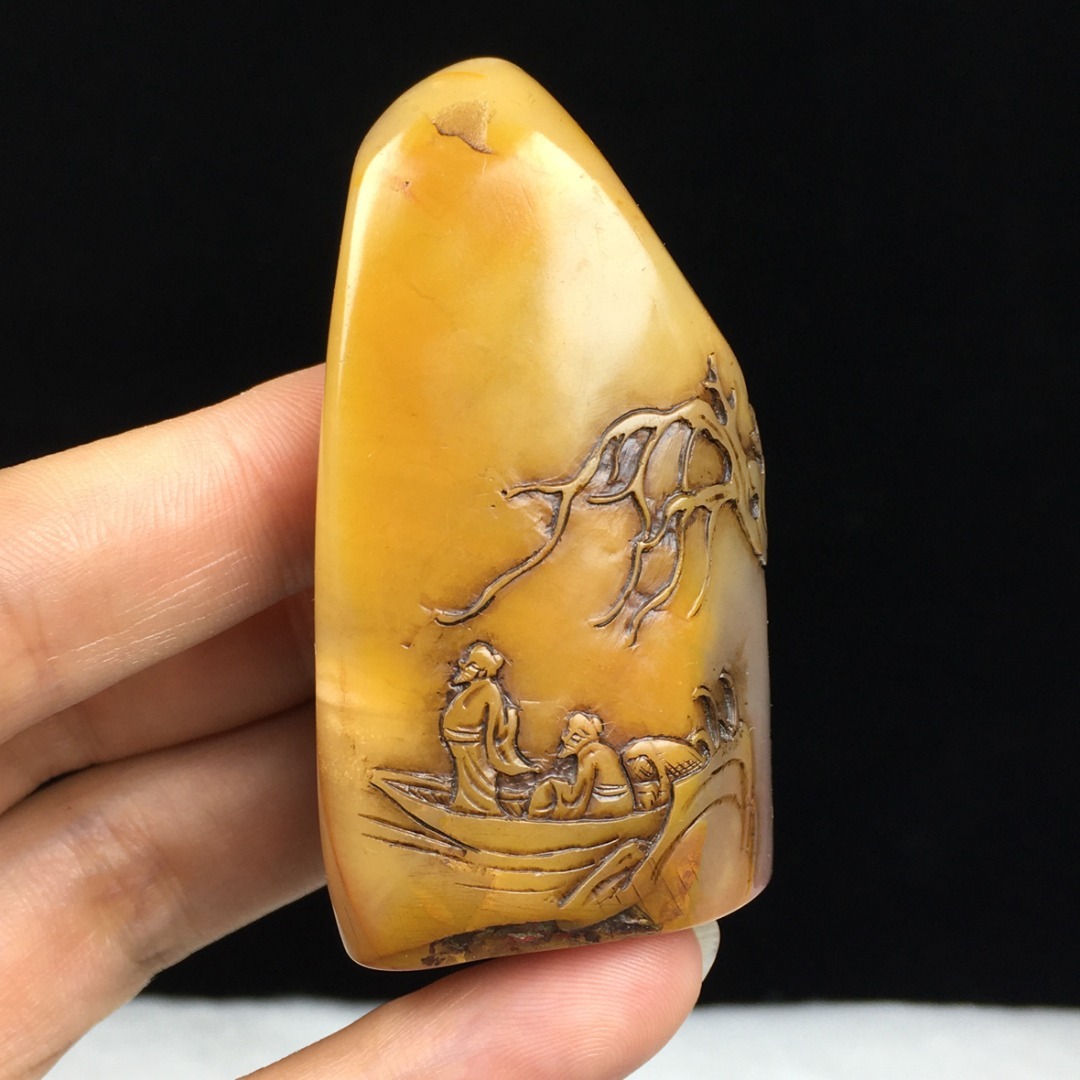旧蔵 【清代篆刻家 金農 号:冬心】寿山石 田黄石 薄芸舟遊び 印鑑 天然石 手彫 篆刻 古印材 極細工 中国古玩 骨董品 古美味 207