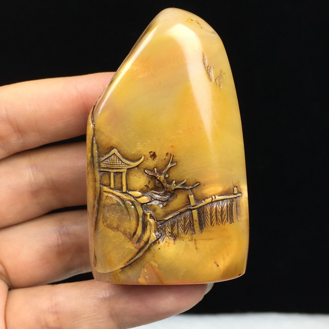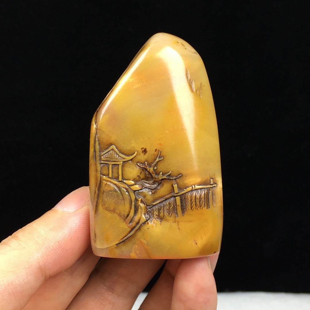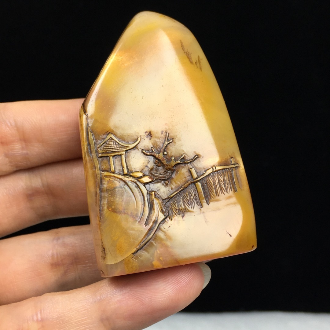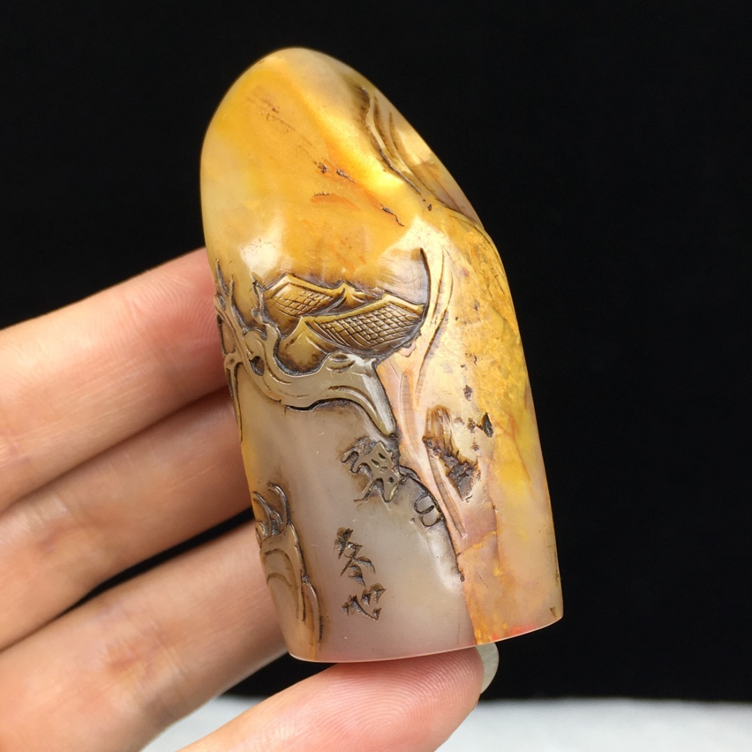 旧蔵 【清代篆刻家 金農 号:冬心】寿山石 田黄石 薄芸舟遊び 印鑑 天然石 手彫 篆刻 古印材 極細工 中国古玩 骨董品 古美味 207