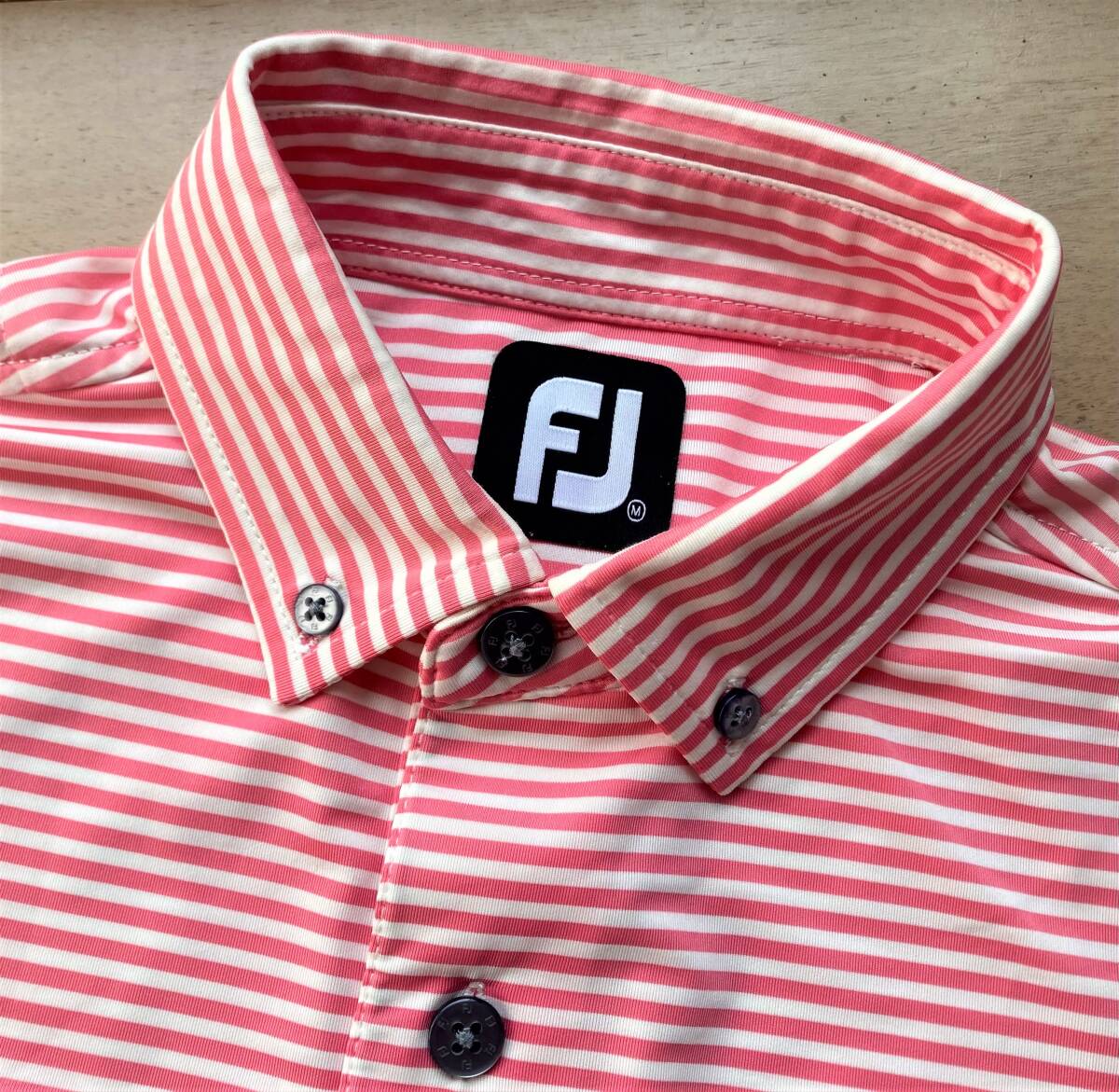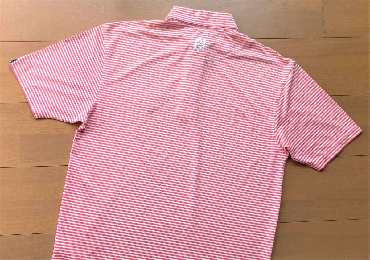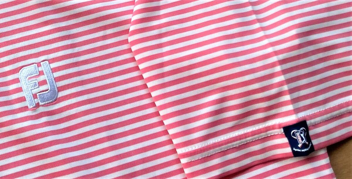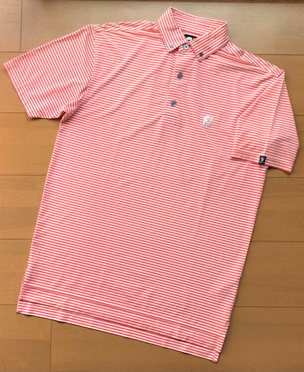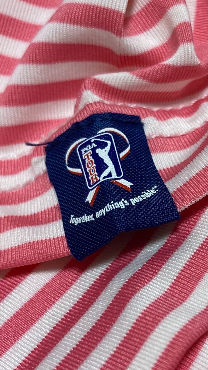 ◎ホワイト×ピンクのボーダー、左胸のFJロゴ、左袖にPGATOURのロゴがきまっています。ストレッチ素材で快適な着心地。