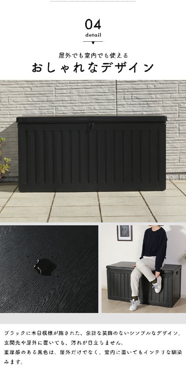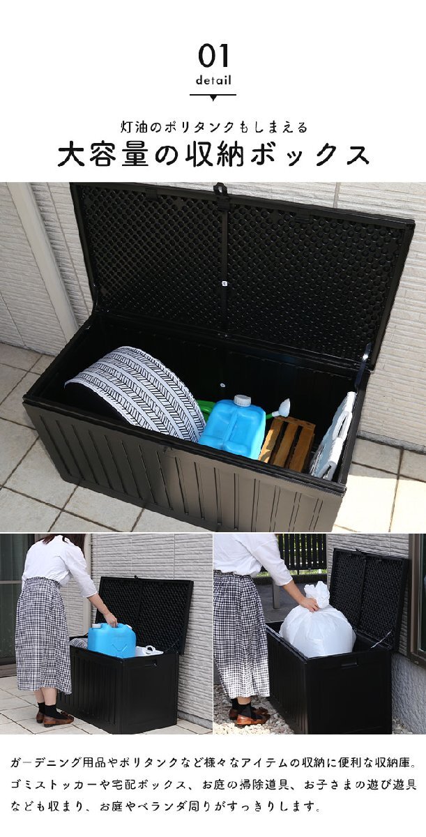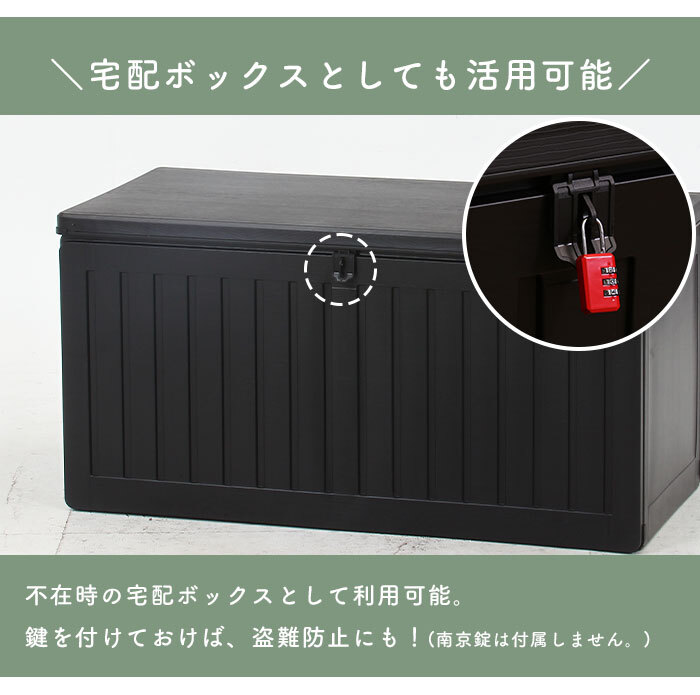 | 屋内でも屋外でも使用できる便利な収納ボックス。 ブラックに木目模様が施されたシンプルなデザインで、玄関先などの屋外やお部屋でもお使いいただけます。 たっぷり収納できるので、ポリタンク収納やゴミ箱、ガーデニング用品の道具入れなど様々なシーンで大活躍。 真空成型されたプラスチック製なので、強度を保ちながらも軽く、水にも強い仕様となっています。 (※防水素材ではありますが、雨ざらしでのご使用はお控えください。) くぼみがあり持ち運びやすい設計で、荷物を収納した状態で持ち上げる際の底耐荷重目安は約5~10kgとなります。 フタは市販の南京錠で施錠できるので、大切な荷物を守ります。 工具不要ではめこむだけの簡単組立。 |