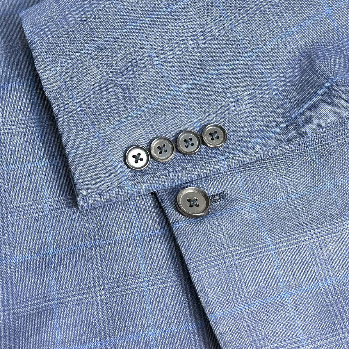 デザイン:フロント段返り3つボタン、背抜き裏地、サイドベンツ、袖開き見せ。