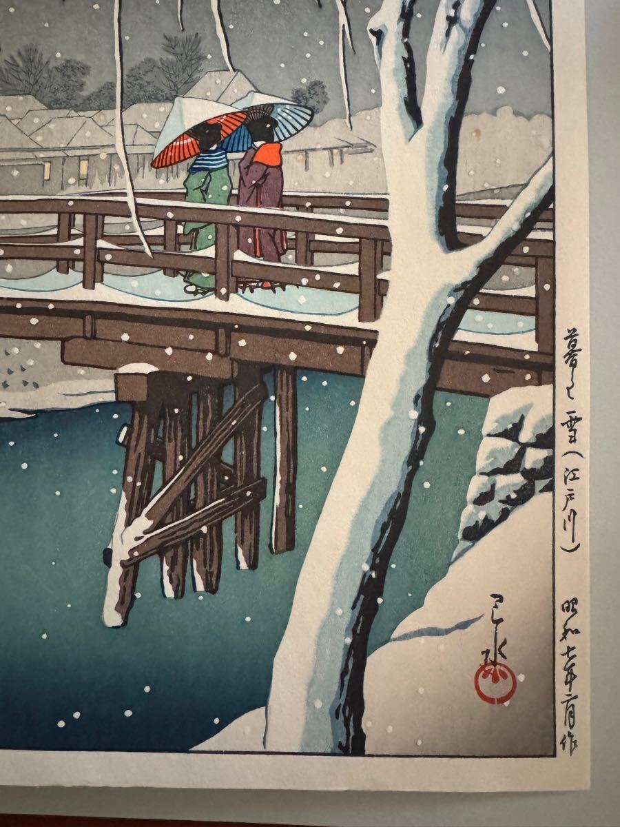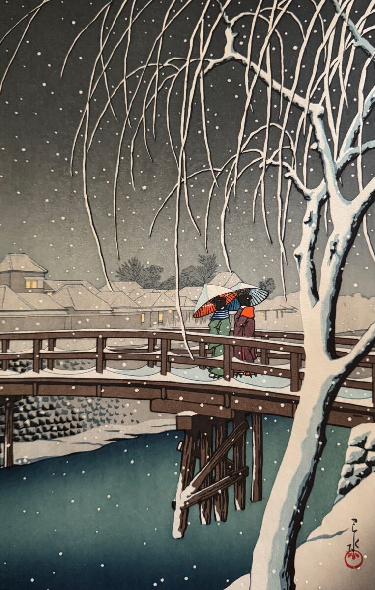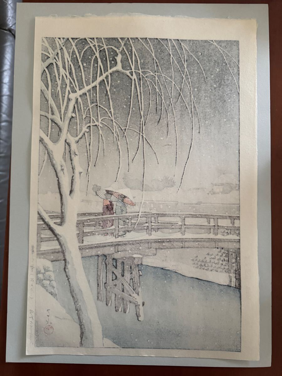 C【真作保証】川瀬巴水 暮るる雪(江戸川)オリジナル 昭和七年 手摺り木版画 後摺 新版画 kawase Hasui woodblock print shinhanga