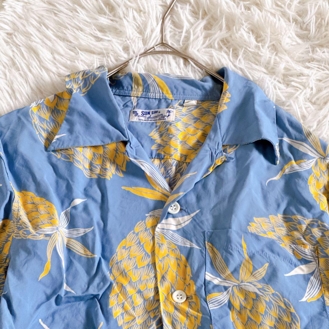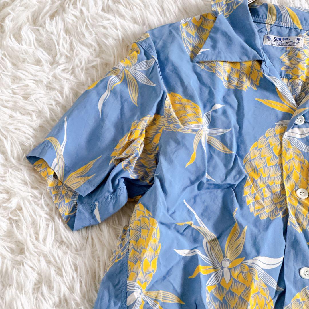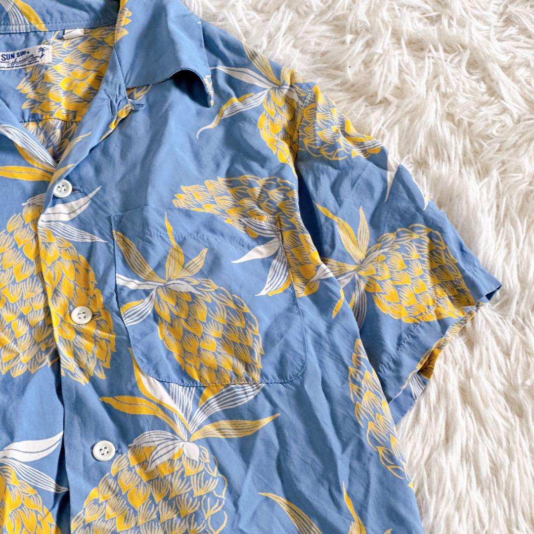 SUN SURF サンサーフ 東洋エンタープライズ アロハシャツ ハワイアンシャツ オープンカラーシャツ 開襟シャツ レーヨンシャツ 半袖シャツ 夏服 リゾートシャツ ヴィンテージアロハ 柄シャツ パイナップル柄 トロピカルシャツ リゾートファッション メンズ レディース ユニセックス M35220 青シャツ ライトブルー イエロー シャツコーデ ブランド古着