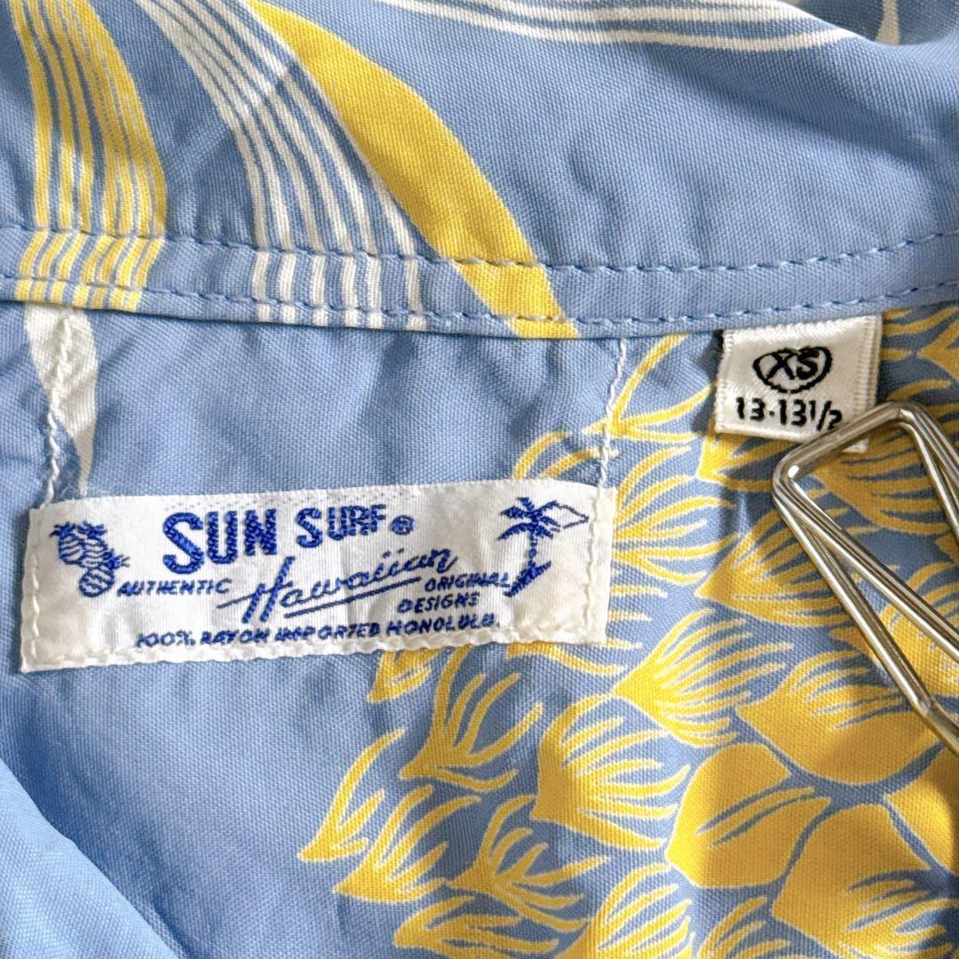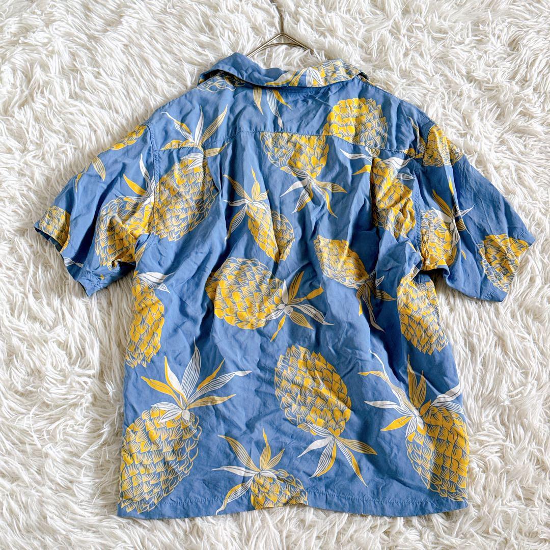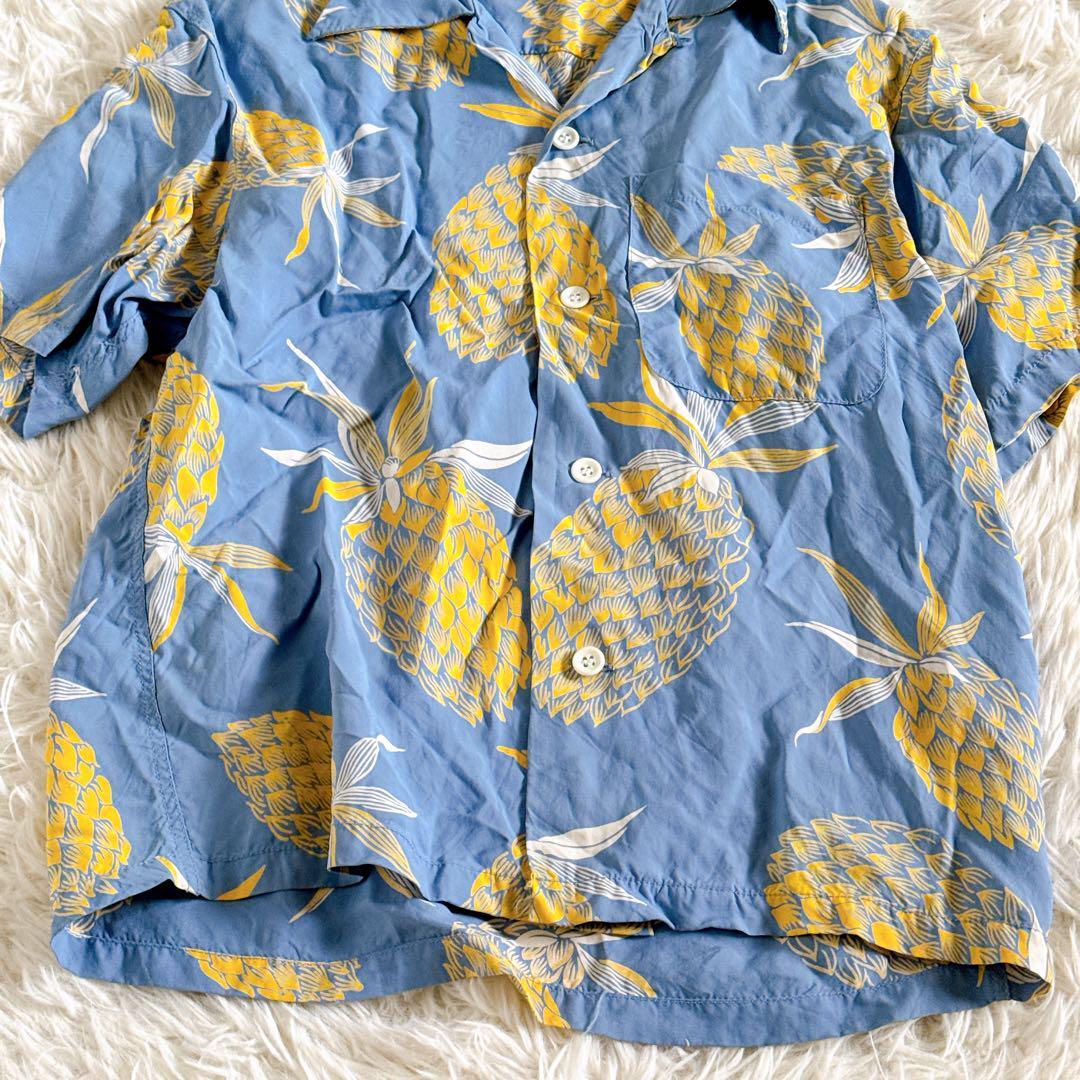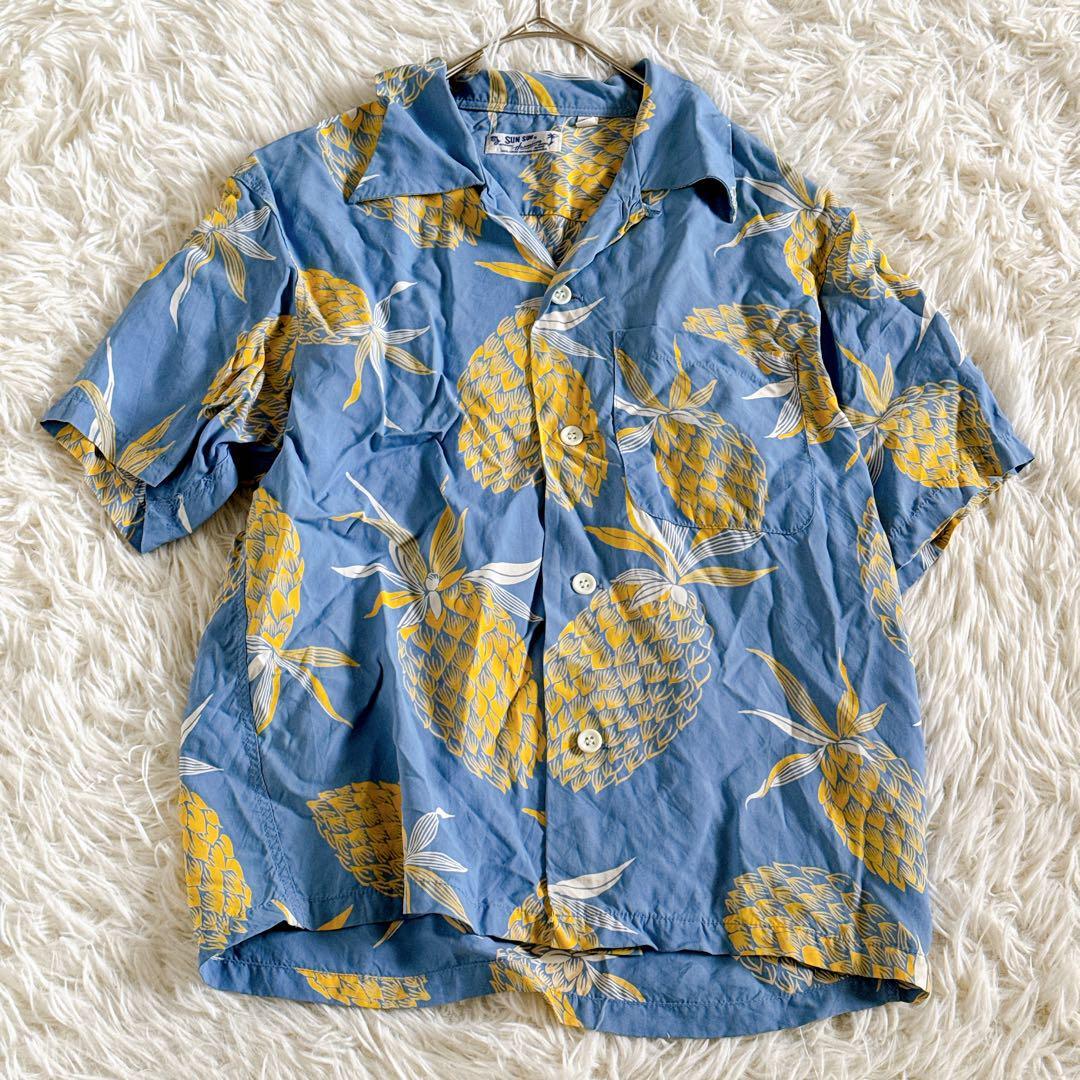 SUN SURF サンサーフ 東洋エンタープライズ アロハシャツ ハワイアンシャツ オープンカラーシャツ 開襟シャツ レーヨンシャツ 半袖シャツ 夏服 リゾートシャツ ヴィンテージアロハ 柄シャツ パイナップル柄 トロピカルシャツ リゾートファッション メンズ レディース ユニセックス M35220 青シャツ ライトブルー イエロー シャツコーデ ブランド古着