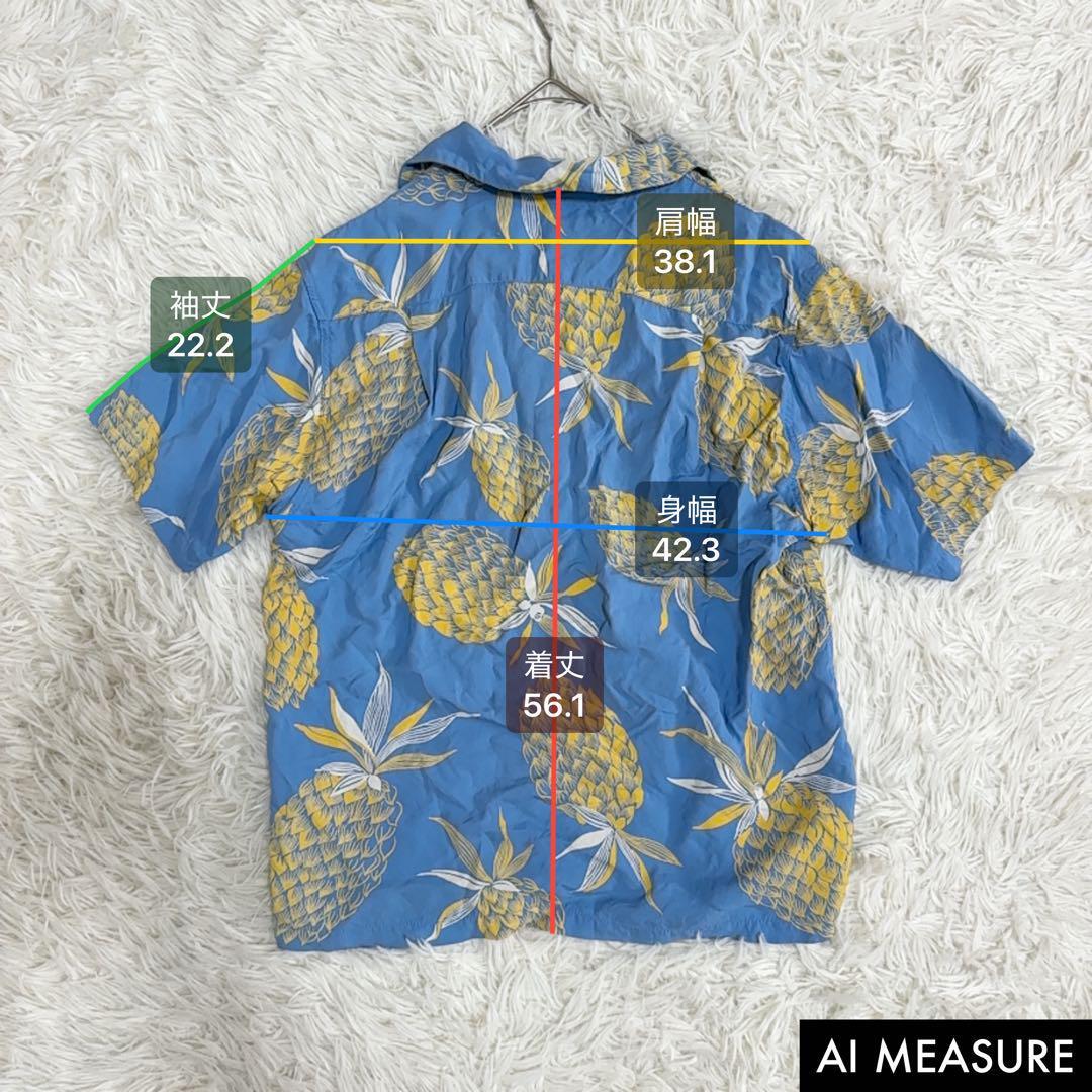 水色の爽やかなレーヨン生地に、黄色や白のパイナップル柄が全面に描かれた、夏らしい一着です。
