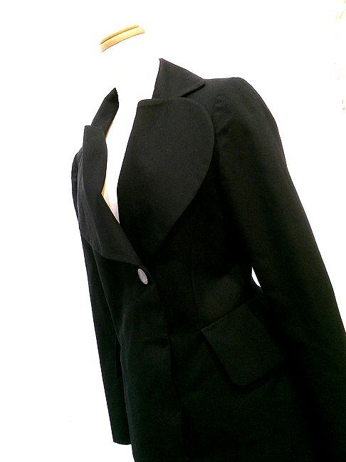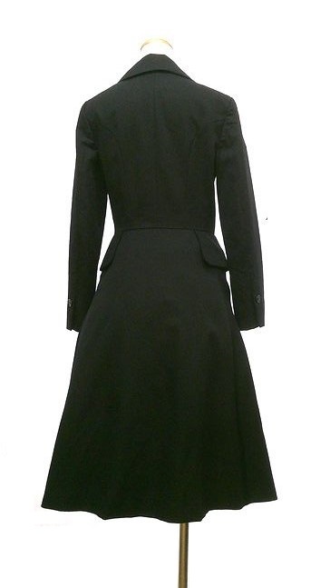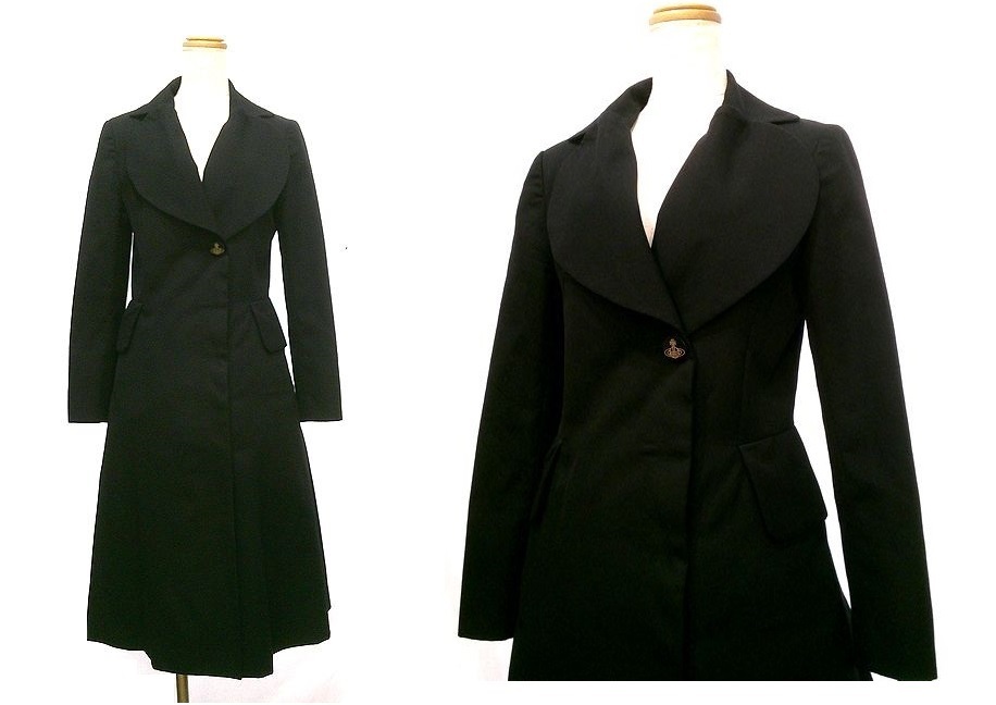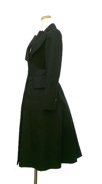 Vivienne Westwood のラブ襟ORBボタンワンピースです。襟が立体的な大きいハート型で、胸下に大きいオーブのボタンがあしらわれています。両サイドにはポケットがつきます。フロントボタンなのでコート感覚で着られても!!とてもかっこいいデザインで、幅広いシーンでおしゃれに着て頂けます。状態は若干の使用感程度。サイズは00、肩幅41cm、身幅47cm、着丈106cm、袖丈59cm。F20250722