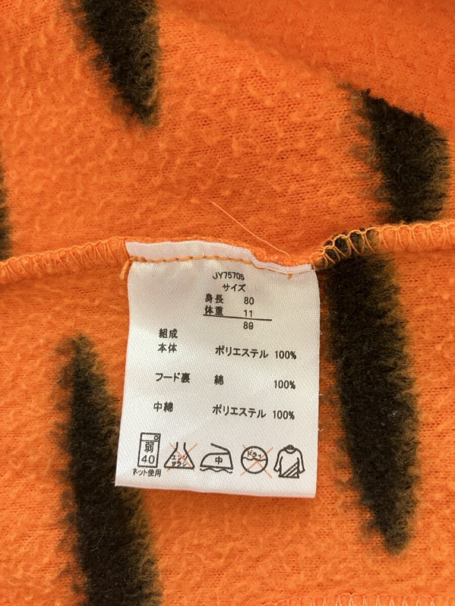 フリース素材のオレンジ色トラの着ぐるみ、フードには可愛い顔のデザイン付き。