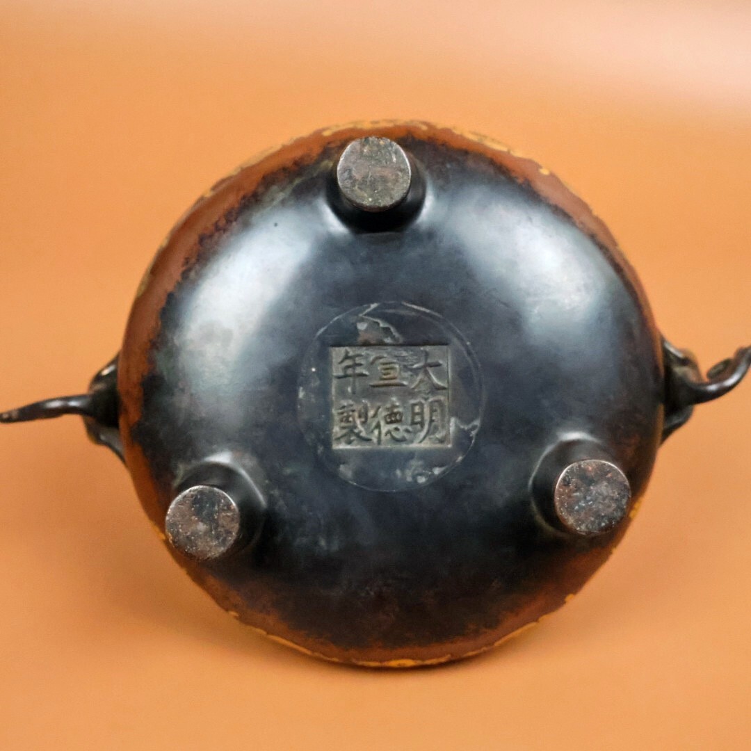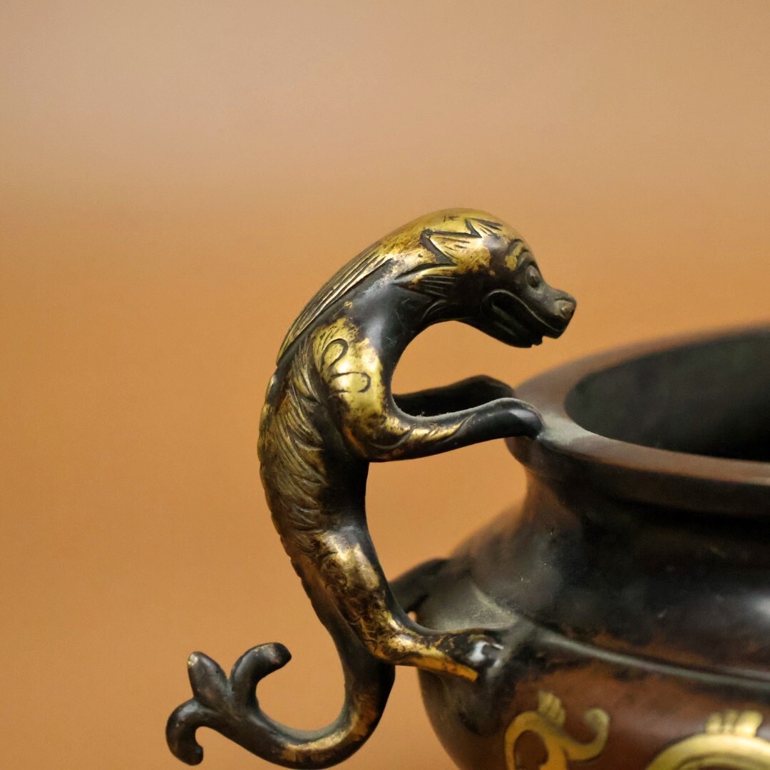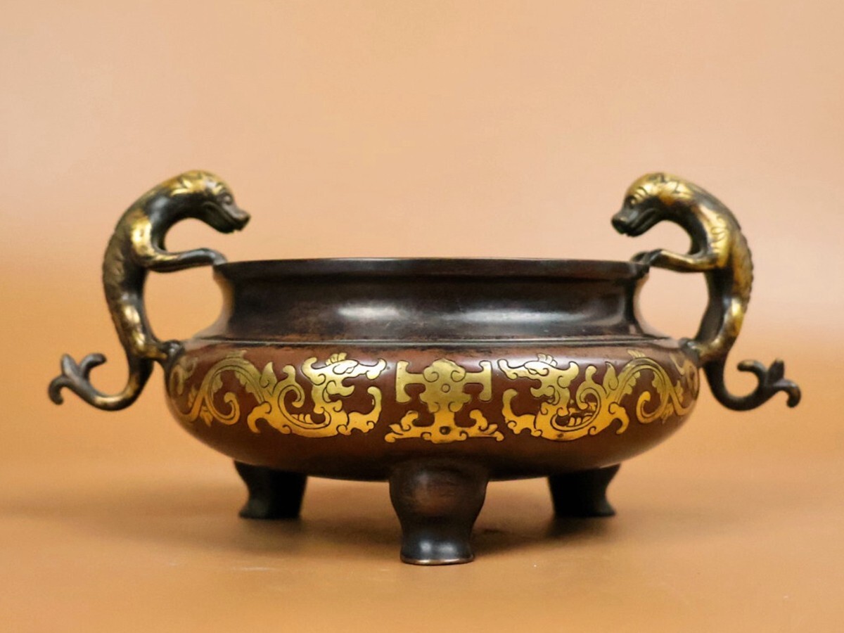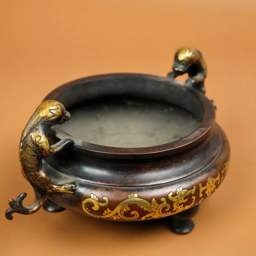 【瓏】古銅鏨刻彫 塗金双獣耳香炉 大明宣徳年製 銅器 古美術 骨董品 香道具 蔵出