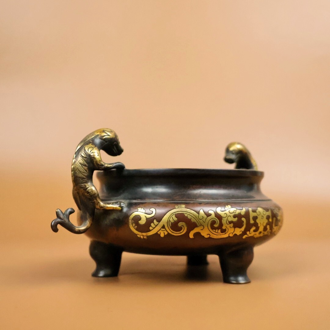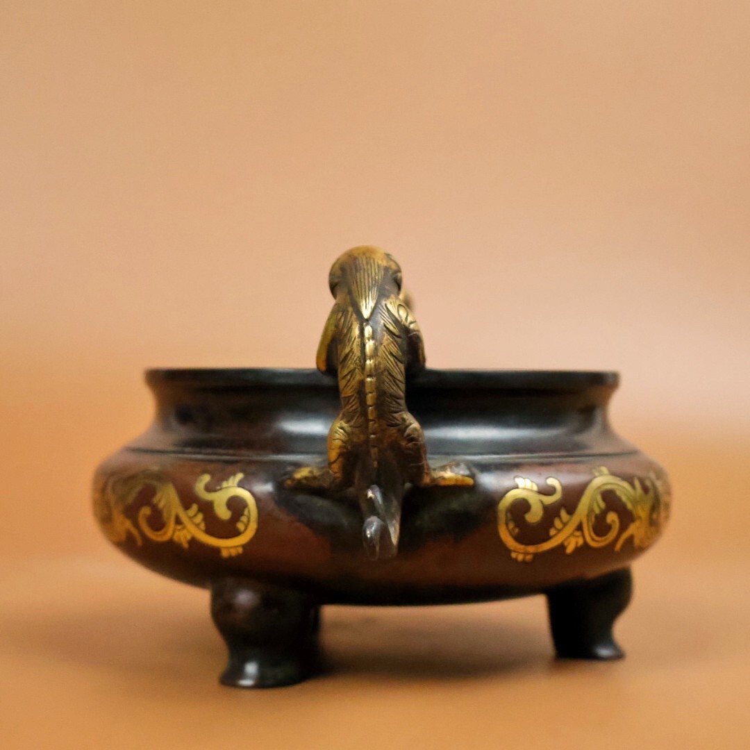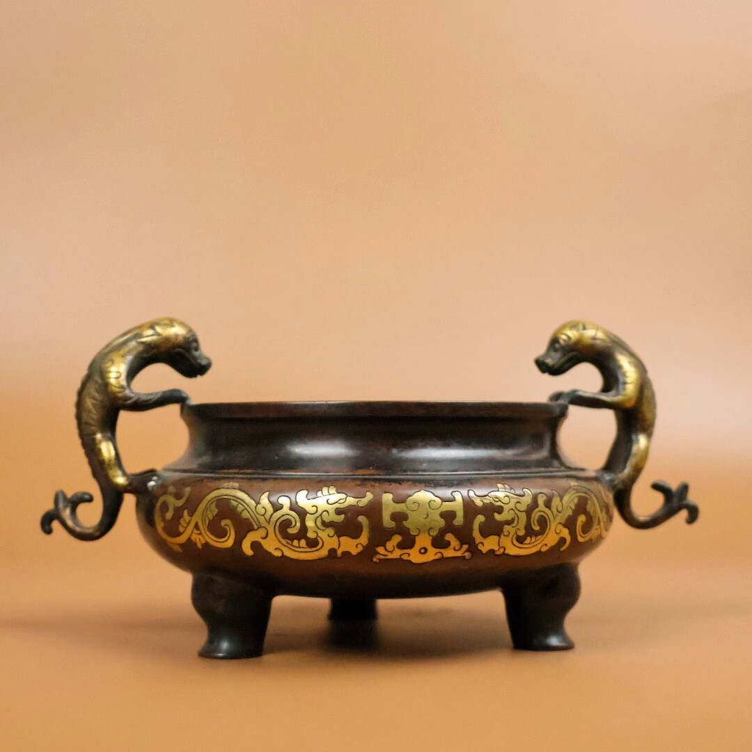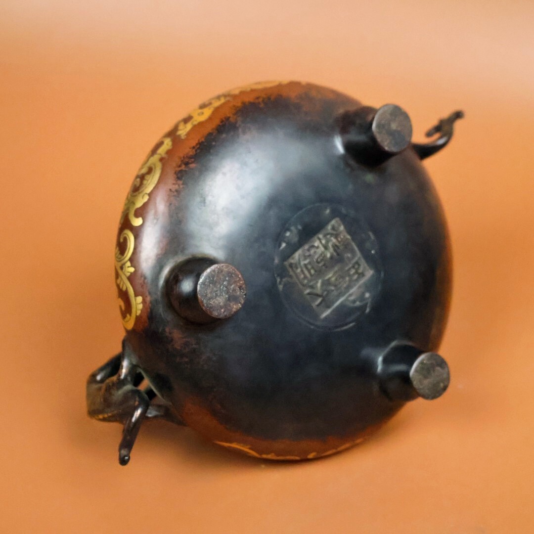 【瓏】古銅鏨刻彫 塗金双獣耳香炉 大明宣徳年製 銅器 古美術 骨董品 香道具 蔵出