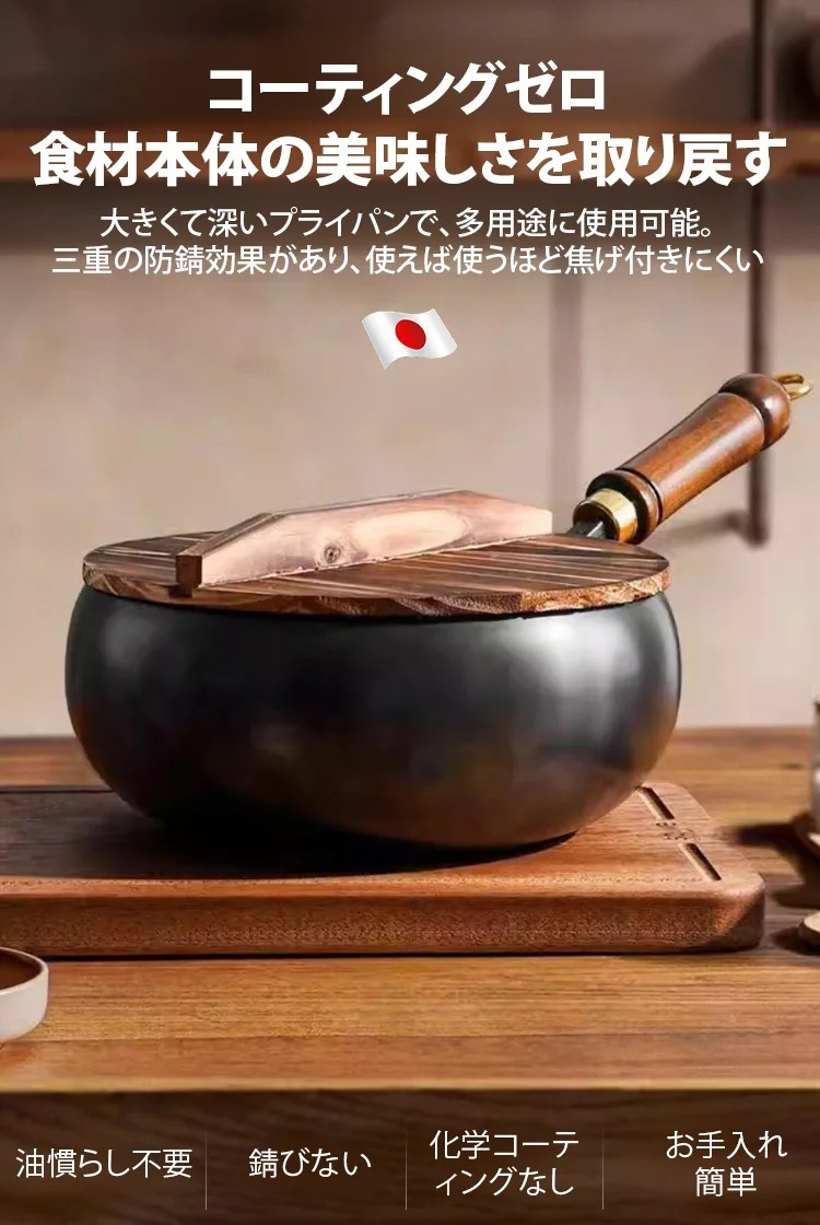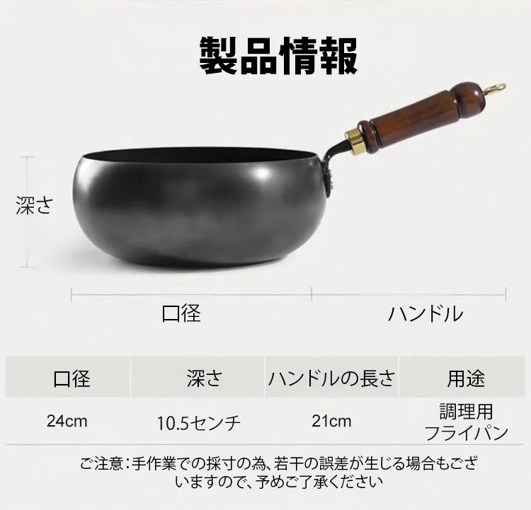 フライパン 口径24センチ・深さ10.5センチ・ハンドル長さ21センチ。