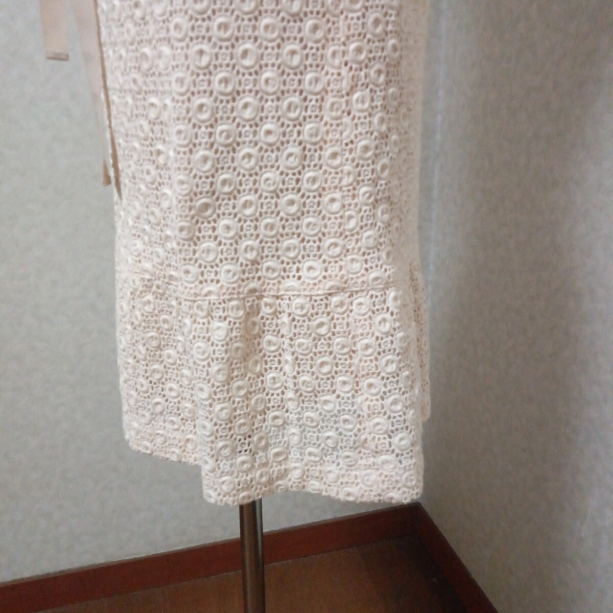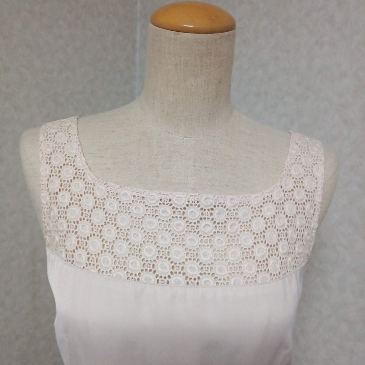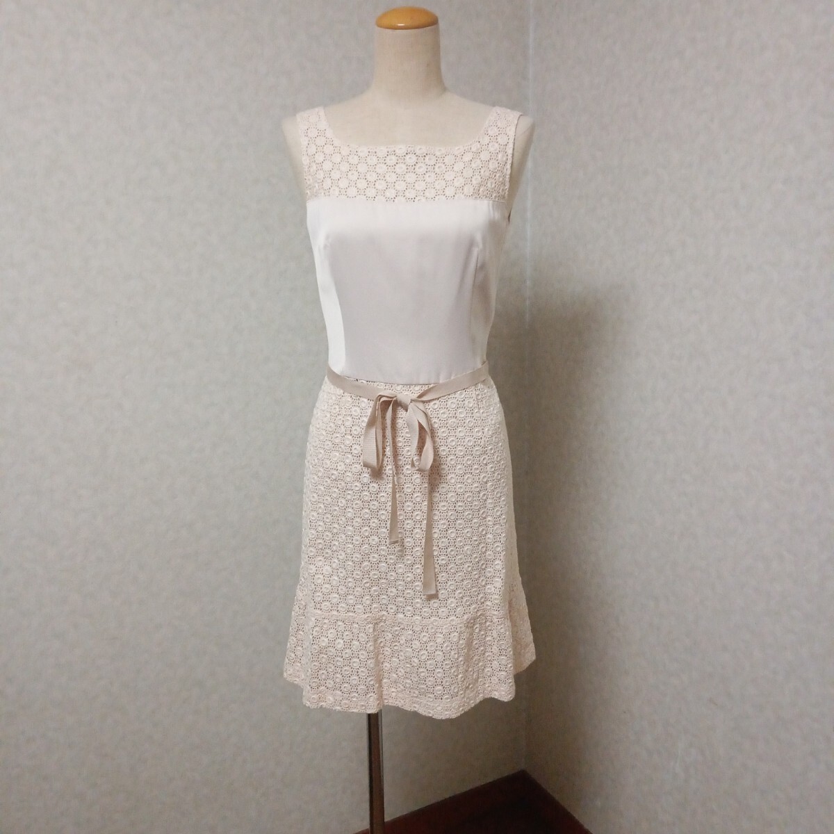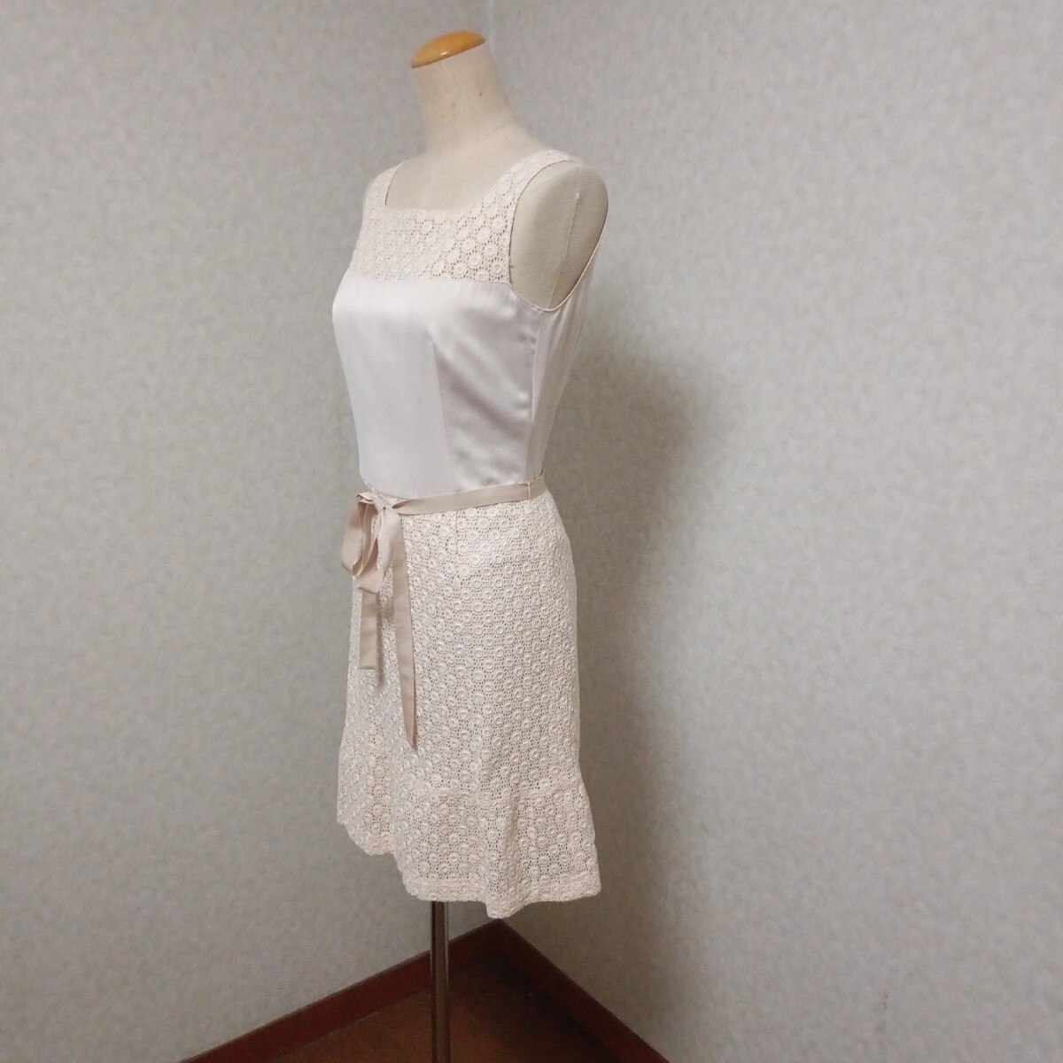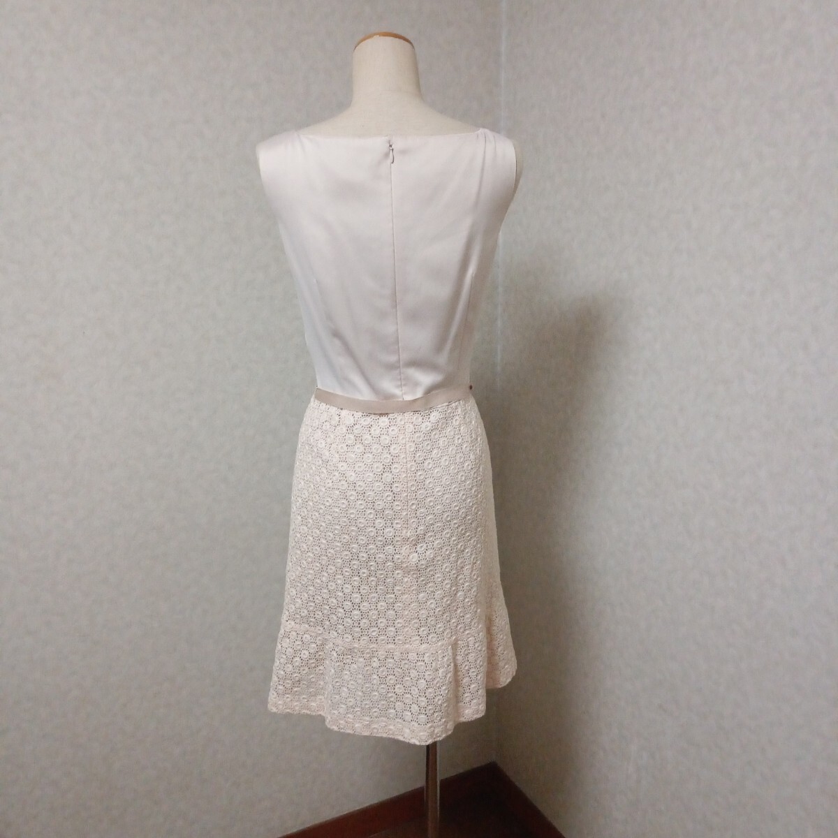 ベージュのノースリーブワンピース、サテンとレース風デザインのコンビネーション。