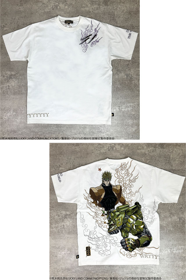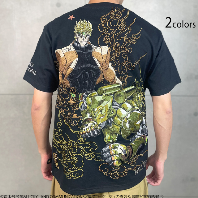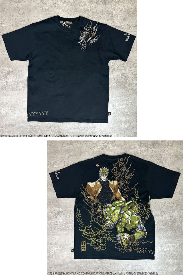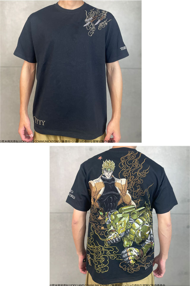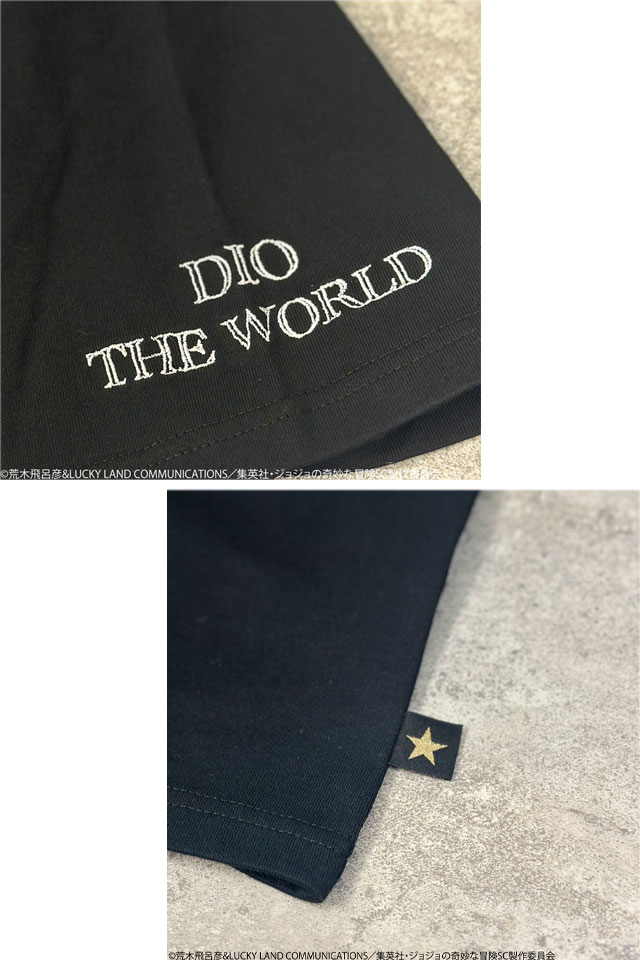 超人気のJOJOコラボに第三部でそのカリスマ性に更に磨きのかかった【DIO】がTシャツとなって登場!! DIO はもちろん、スタンド【ザ・ワールド】を刺繍!! ピスネームはTシャツ限定のデザインを新規企画。 ジョースター家の血筋の証である左肩の星型のアザを入れた、 ジョジョ好きがジョジョ好きの為に作成した最高の一着!! | |||||||||||||||||||||||||