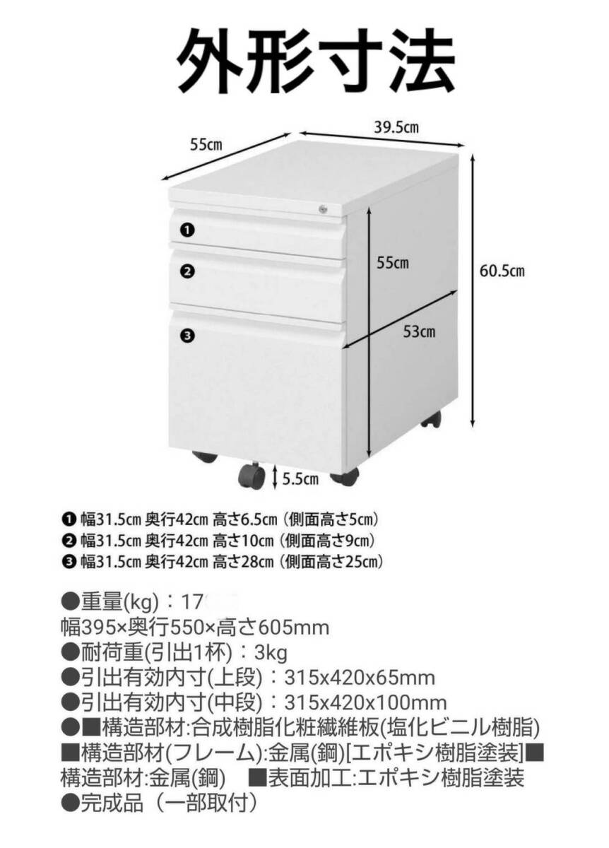 未使用ちょい訳有 インキャビネット 袖机 キャスター・鍵付 KHL-355WH ホワイト ネット通販価格16,000円~