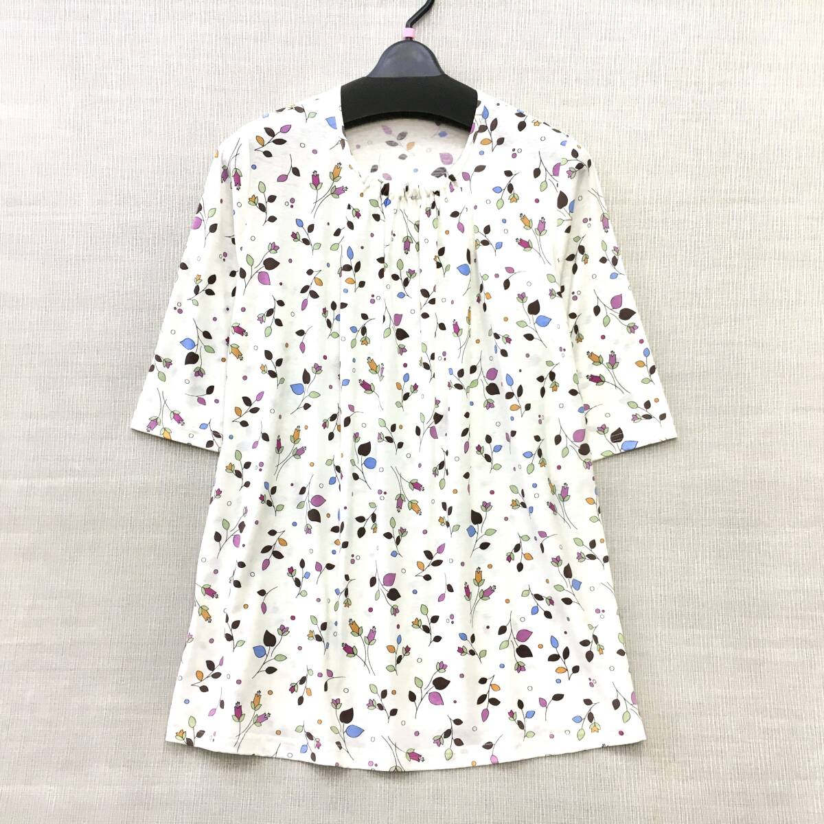 【新品】日本製 高級綿100% 婦人 5分袖 襟元ギャザー 丈長 カットソー M-Lサイズ 送料無料 ゆったりシルエット 手洗いOK 日清紡上質素材