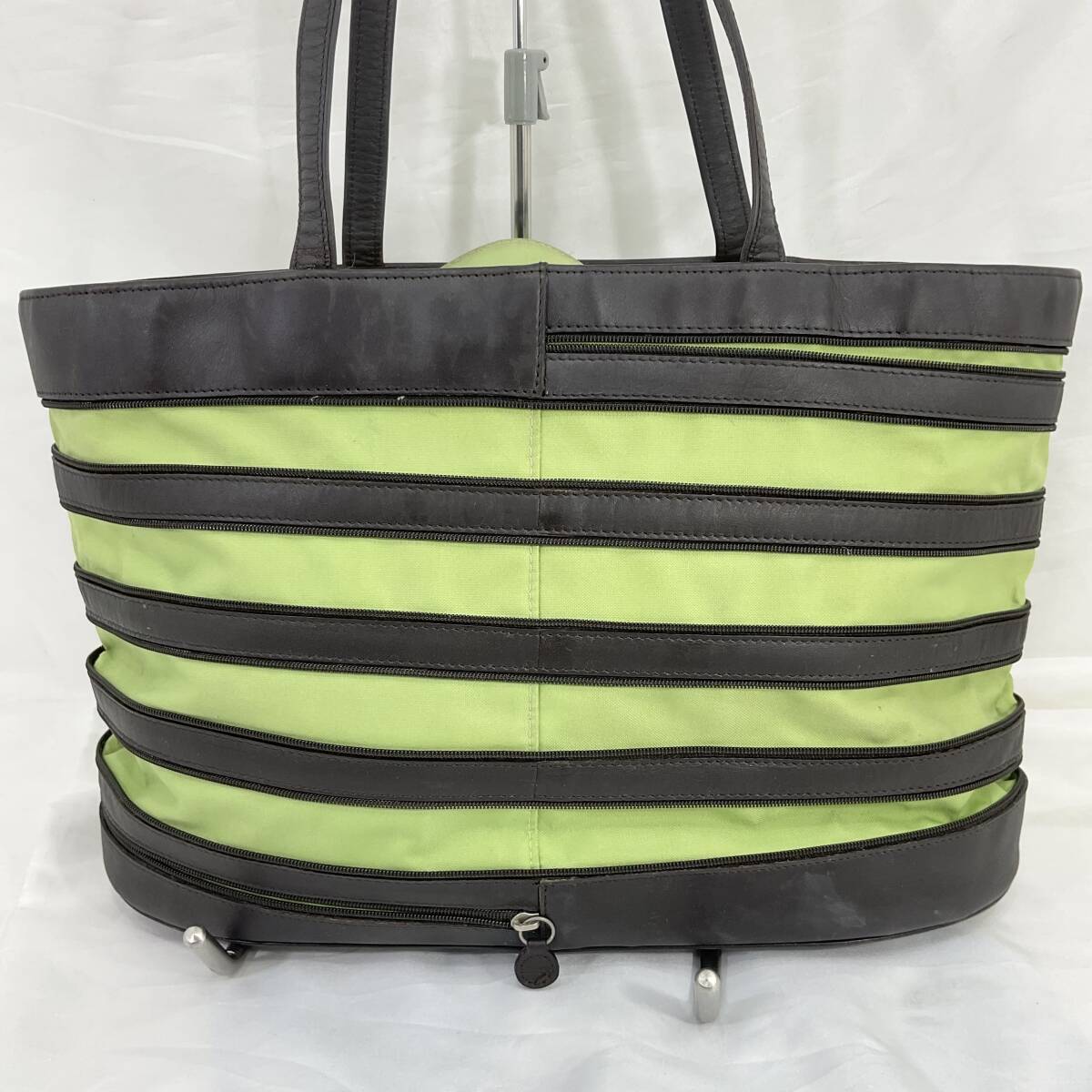ロンシャン ラウンドジップトートバッグ ブラウン×グリーン ボーダー柄 ストライプ柄 レザー レディース LONGCHAMP(C59)