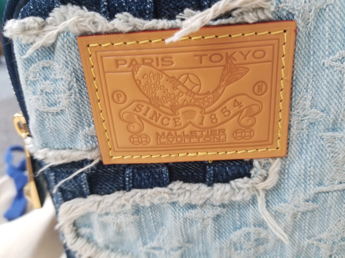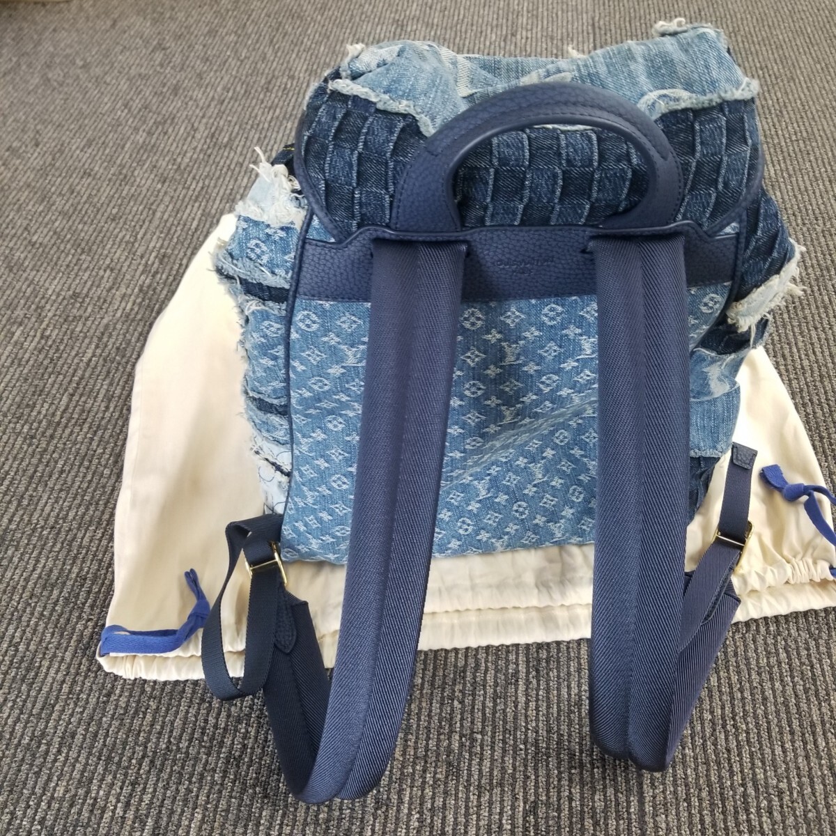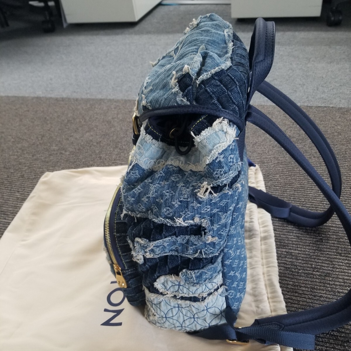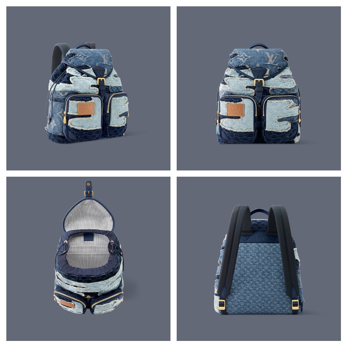 ■「襤褸(ぼろ)刺し子」の技法を駆使したストーンウォッシュデニムの「モンスリ・カーゴ バックパック」。ダミエ・デニムにモノグラム・パターンをあしらったデニムパッチを重ね、職人技が際立つスタイルに仕上げました。ストライプのコットンライニングや、パール風の引き手が付いたファスナーといった贅沢なディテールがデザインを完成させます。