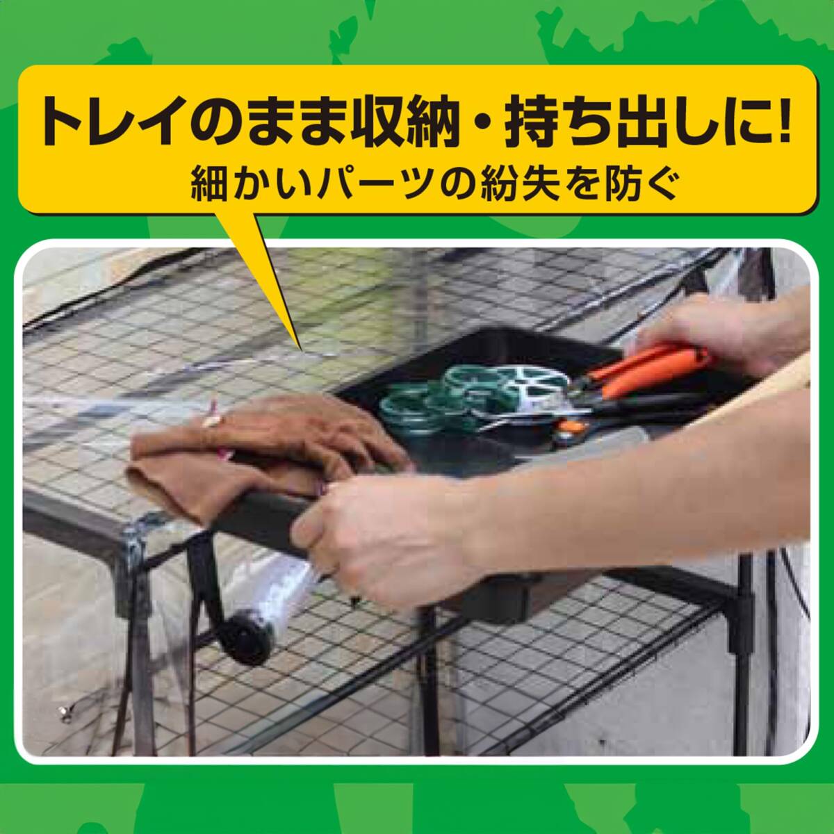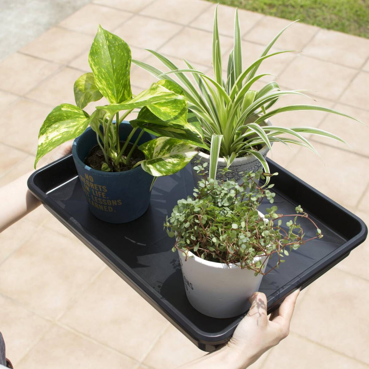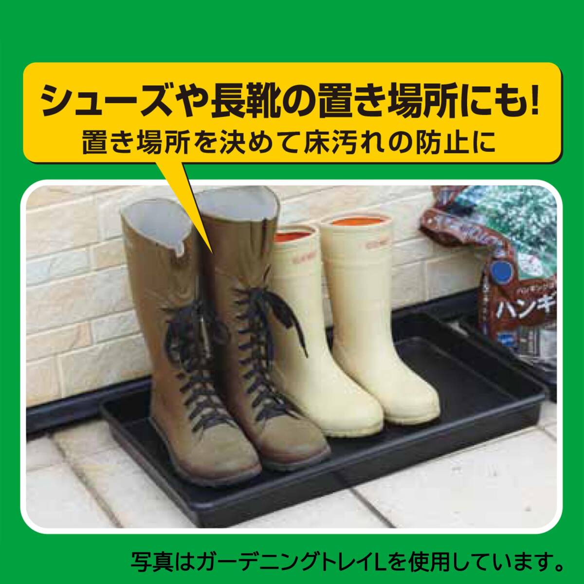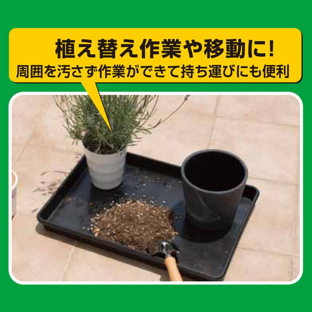 持ち運びに適したガーデニングトレイ トレイのまま収納・持ち出しに。細かいパーツの紛失を防ぎます。 植え替え作業や移動に。周囲を汚さず作業ができて持ち運びに便利です。 シューズや長靴の置き場所にも。置き場所を決めて床汚れの防止に。