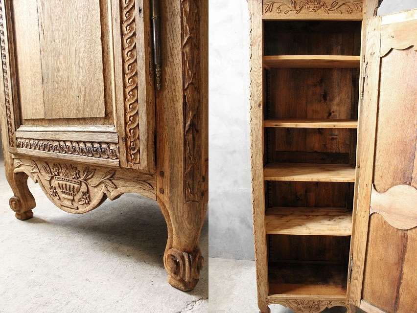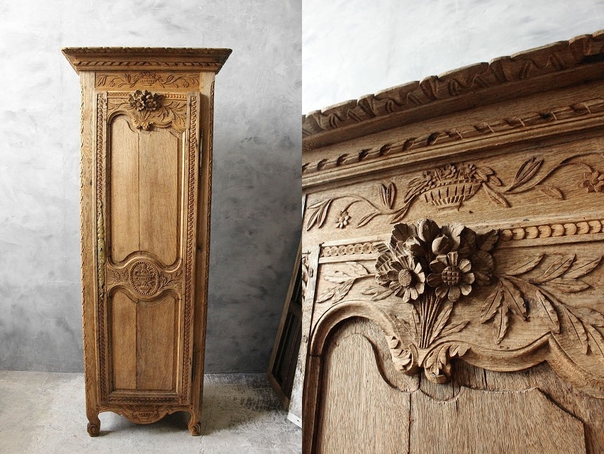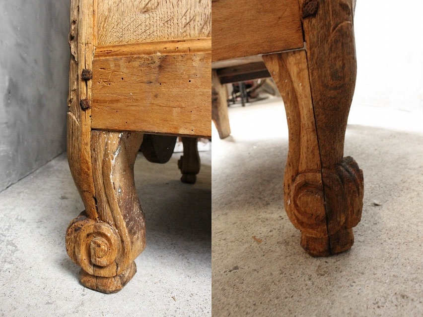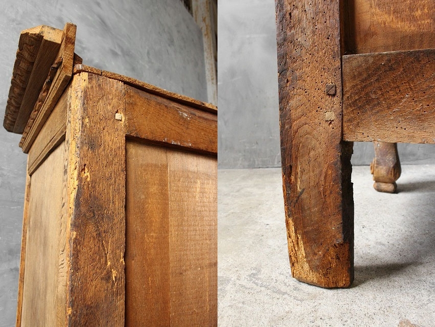 商品説明 岡山STAGEから出品します。フランスで買い付けましたアンティークのウッドキャビネットです。経年使用による雰囲気のある木の風合いと立体的な花やリーフ装飾が非常におしゃれです。1800年代後期ごろのものになり多少のぐらつきはありますが問題ない程度かと思います。ぜひお部屋のインテリアからショップ等の実用兼ディスプレイ什器としてお使いください。鍵は使用可能です。部装飾部は乗せているだけになります。状態ですが、虫食い穴が複数か所ありますが防虫・一部パテ埋め加工を施してあります。その他、経年による木質・金属特有の劣化、木質収縮による隙間、小傷や擦れ、汚れ、木割れや木欠け、歪み、補修箇所等いった使用感はありますが雰囲気を損ねるような目立つダメージもなく問題ない状態かと思います。ただあくまでアンティークになりますのでご理解いただける方のご購入をお願いします。 サイズ 高さ約200.5cm、横幅約80cm、最大奥行き約49cm、本体奥行き約42cmになります。 発送方法 アートセッティングデリバリーの家財おまかせ便のEランクで行います。(家財おまかせ便は集荷が予約制になりますので、発送はご入金確認後に最短2日後〜になります。) コメント 店頭にも出しています。タッチの差で売れた場合はご了承ください。 STAGEホームページ https://www.stage-stage.com/ |