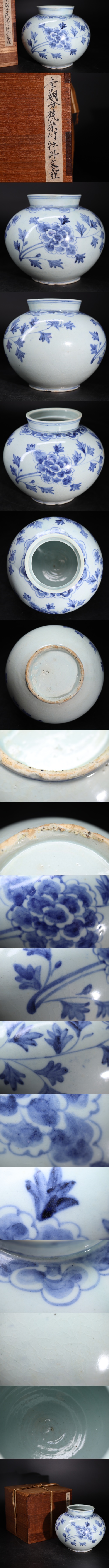 | 「 李朝 分院 染付 牡丹文 壺 」 木箱付 / 朝鮮古美術 丸壺 飾壺 花器 煎茶飾 分院里 .G2045 |