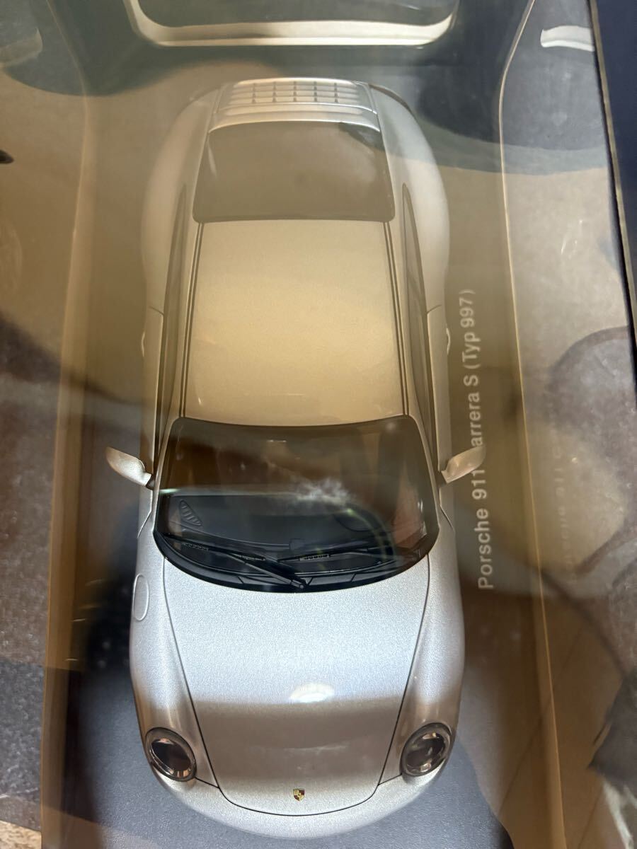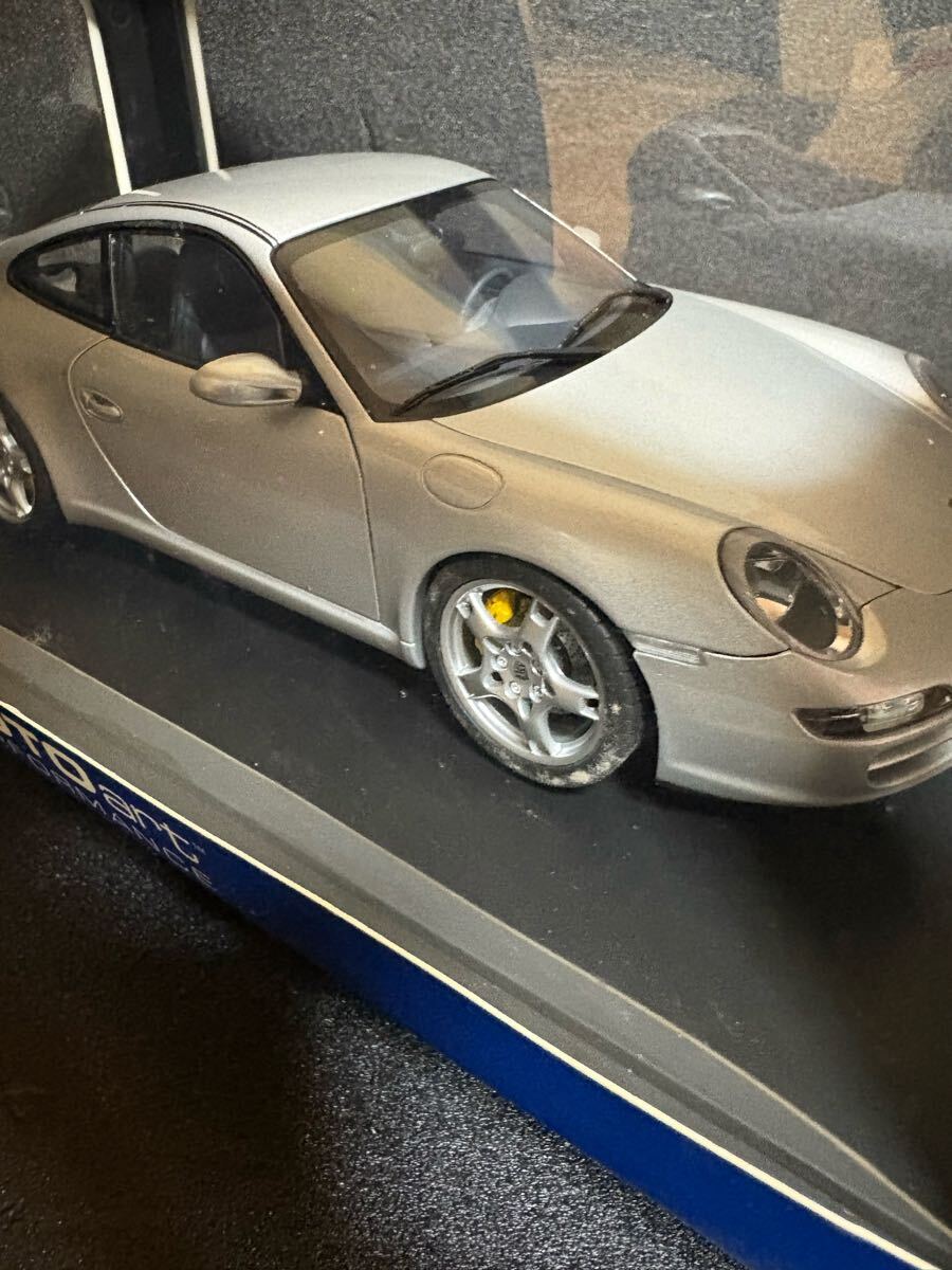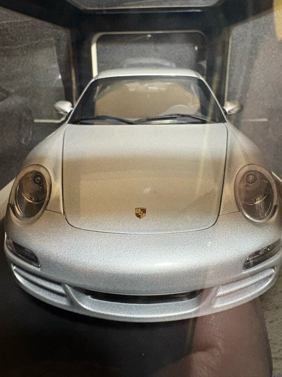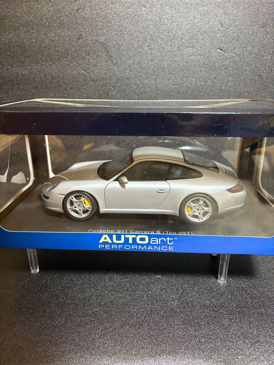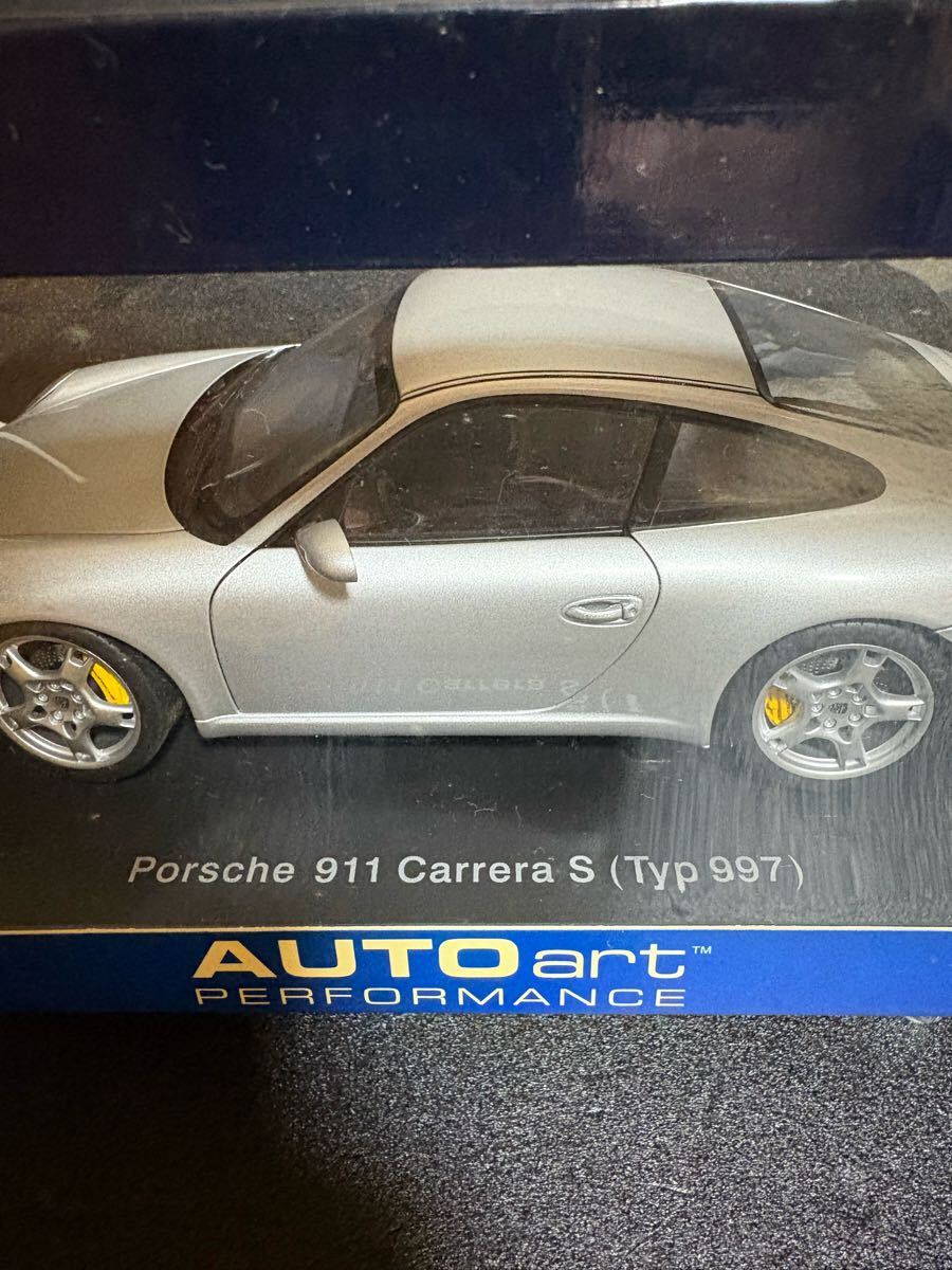 AUTOart製の1/18、Porsche 911 Carrera S (Typ 997)の精密ミニカー、シルバー仕上げでディテールが豊か。
