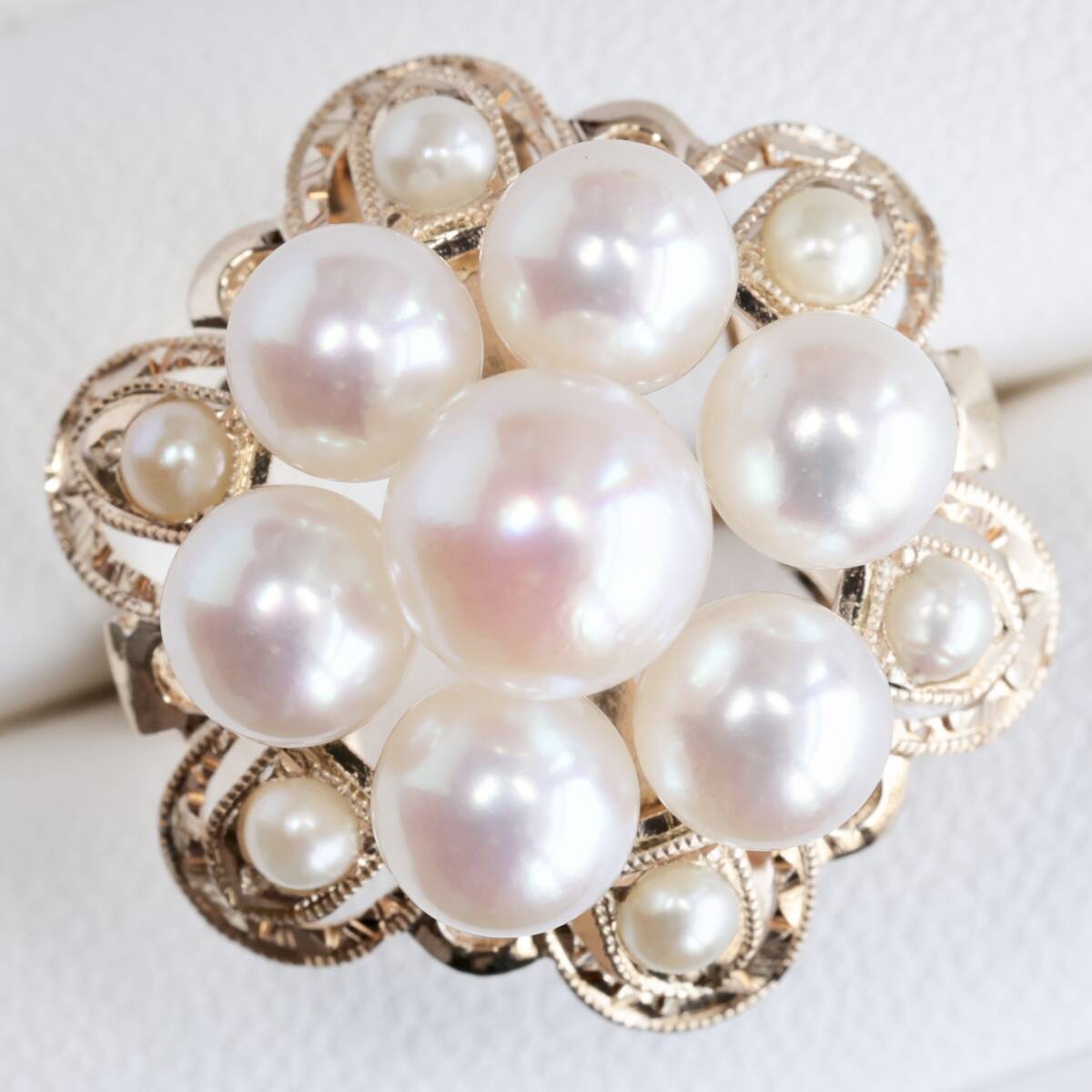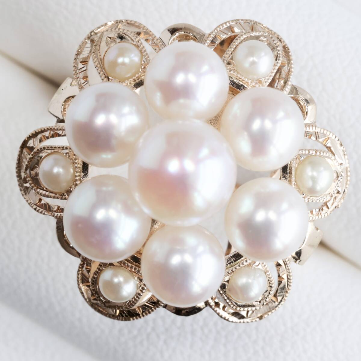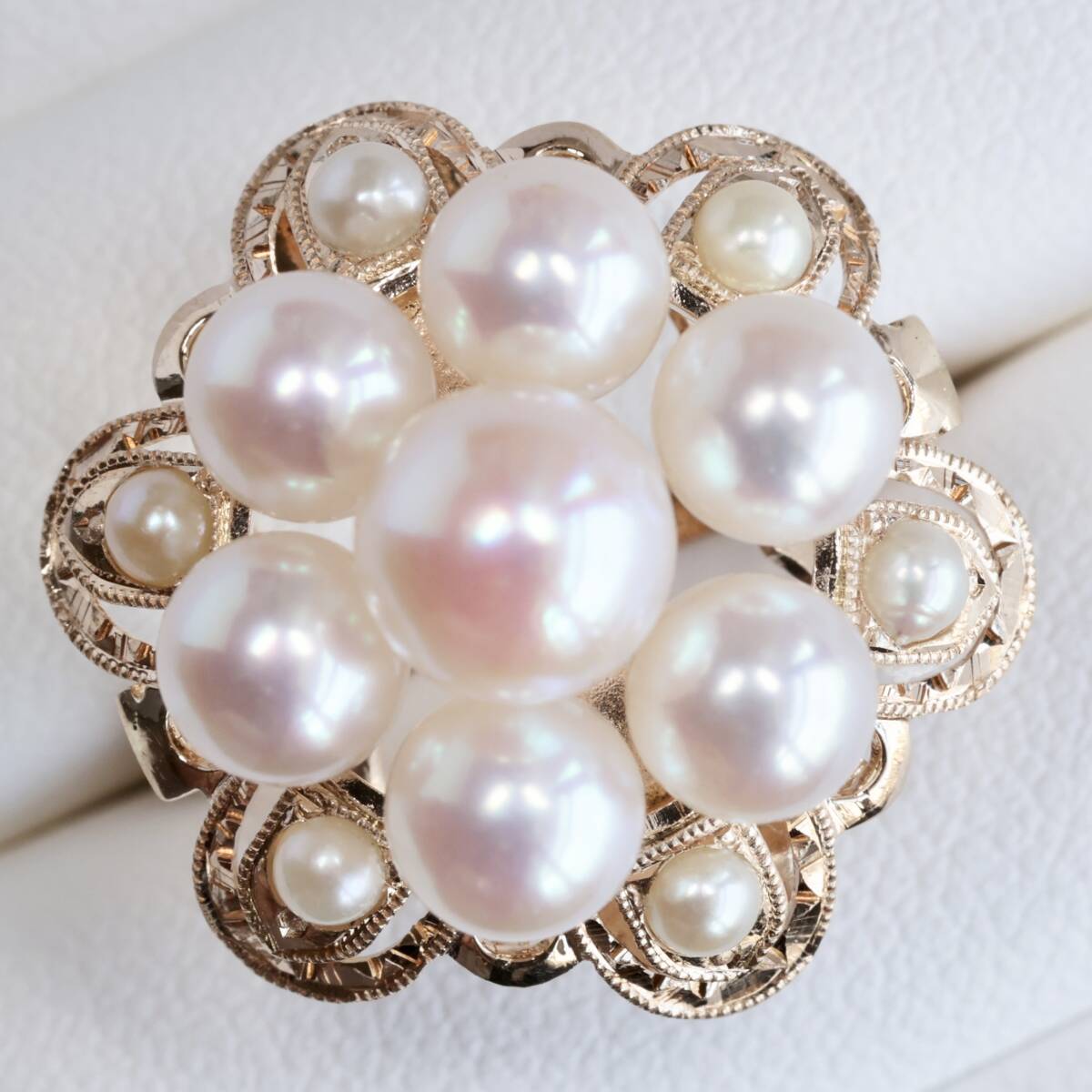 7.0mm程のあこや真珠を5.5mm前後のあこや真珠と2mm台のごく小さなベビーパールで取り巻いた華のあるリング。