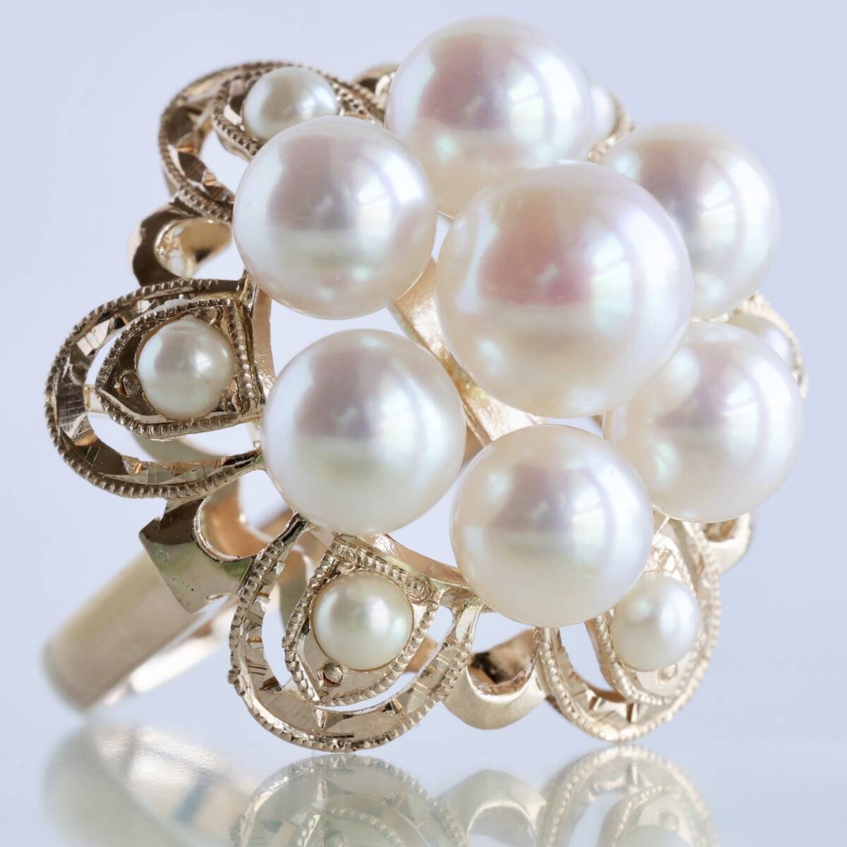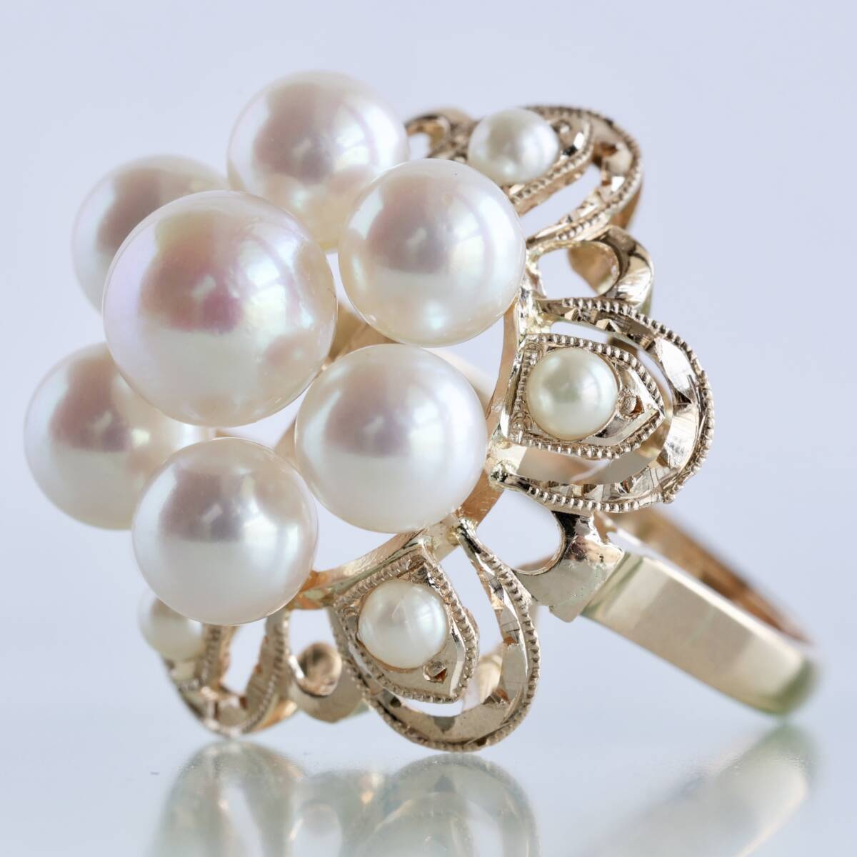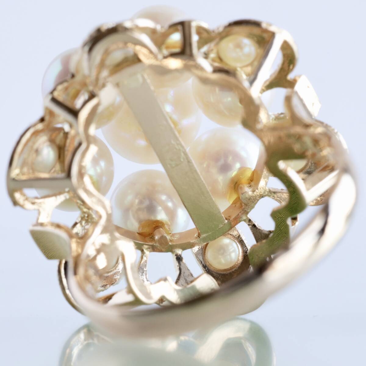 7.0mm程のあこや真珠を5.5mm前後のあこや真珠と2mm台のごく小さなベビーパールで取り巻いた華のあるリング。